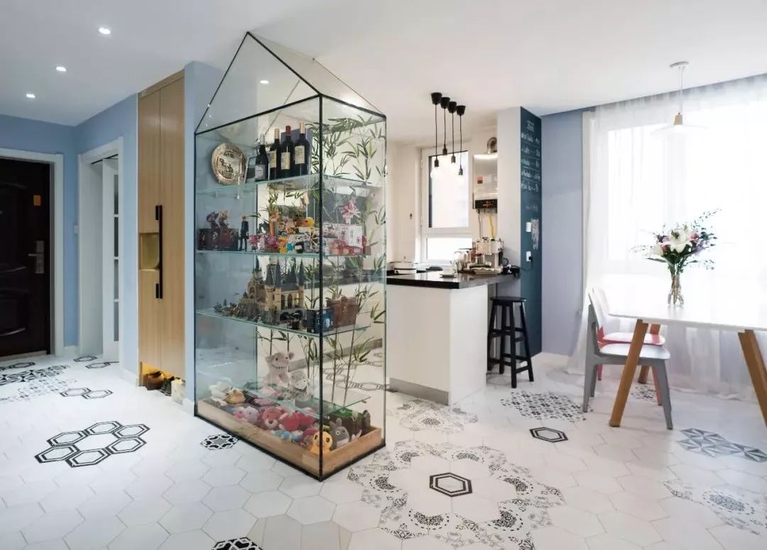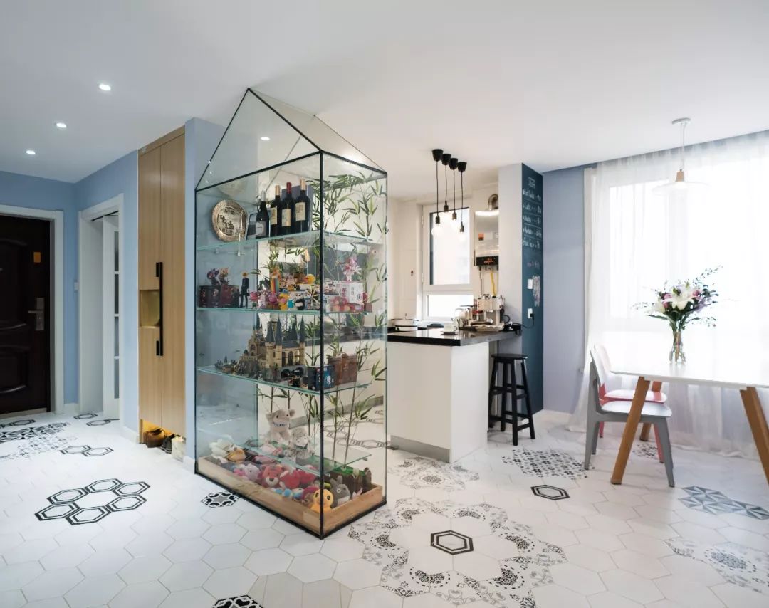 客厅看向玄关、餐厅方向,微景观为灵感放大出来的玻璃花房。地面的六角拼花作为区域的划分并为空间增添活泼感。