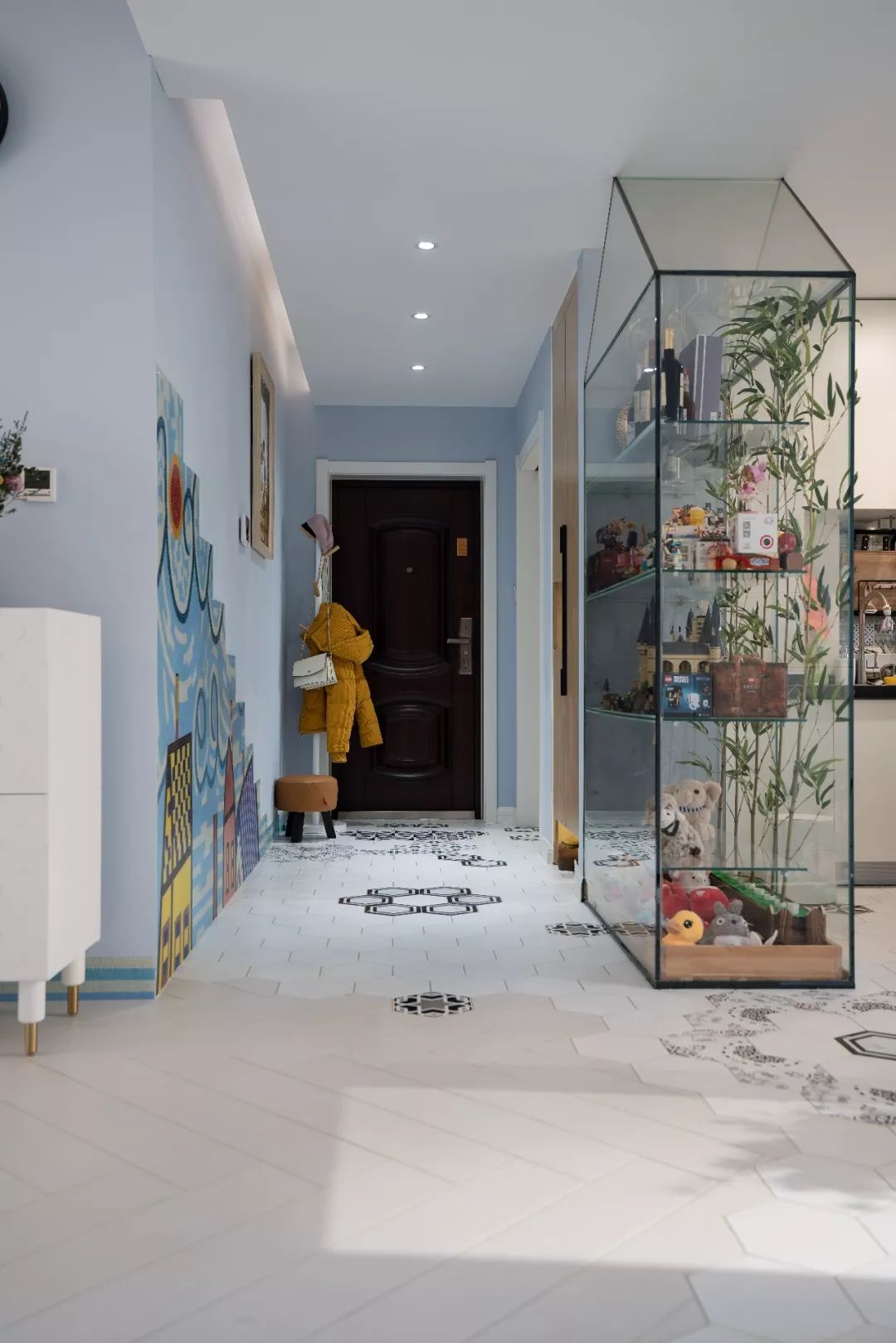 入户右侧的墙面是一幅定制的马赛克画,入户左侧做嵌入式鞋柜,节省空间,并规划出景观柜的位置,进门第一眼就爱上了这样的家。