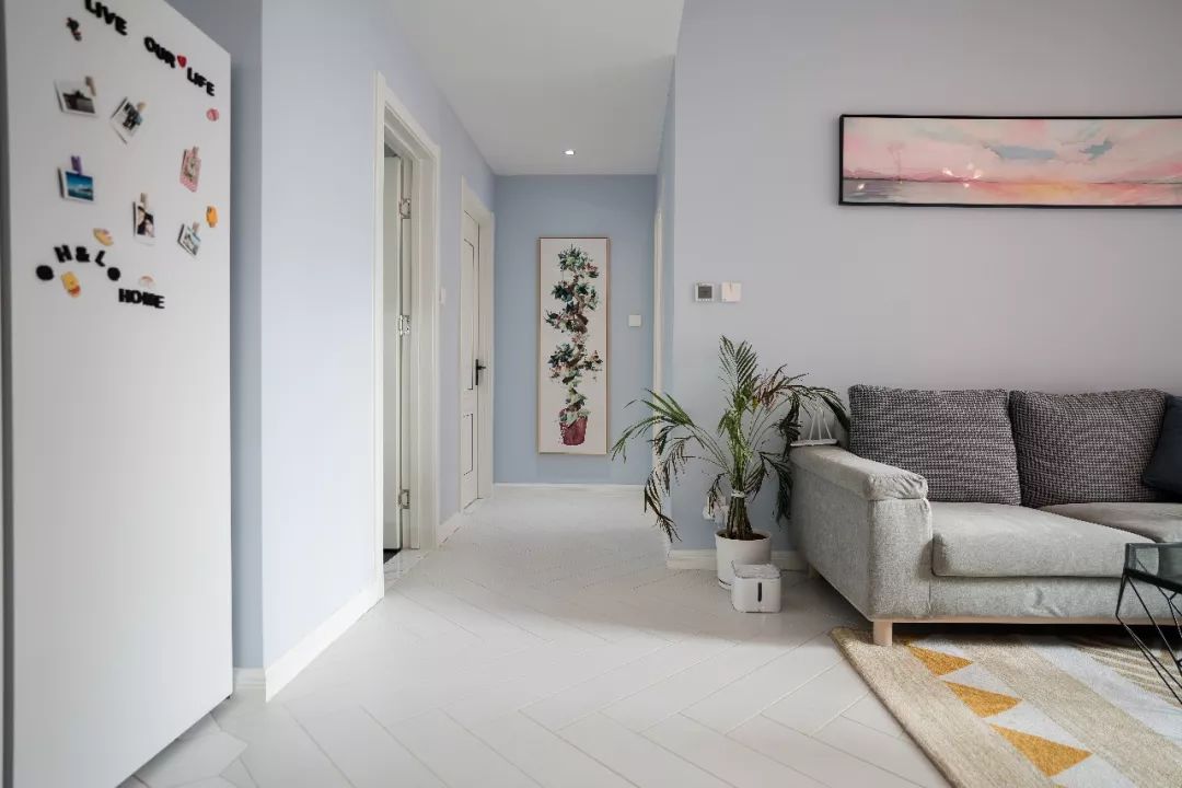 客厅与过道的墙面使用了天空蓝乳胶漆,清新又明亮。沙发背景墙上的装饰画如天空中那道晚霞,美得绚丽!