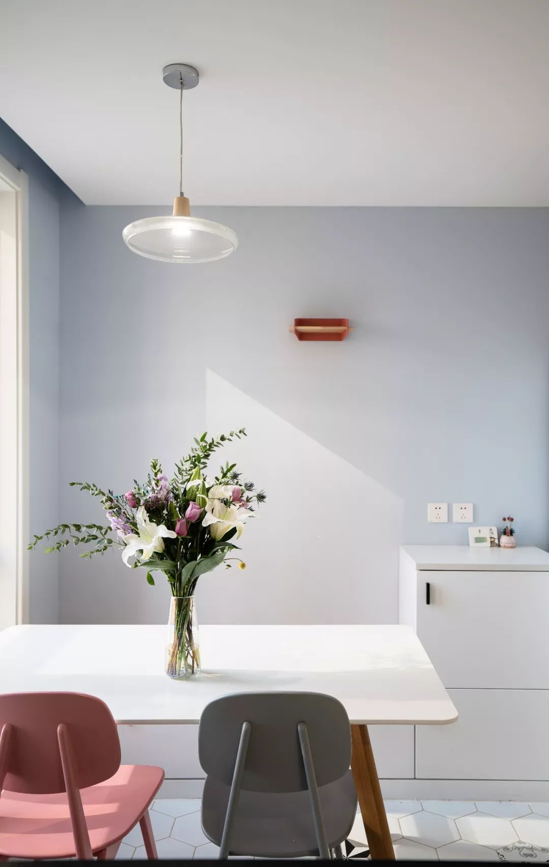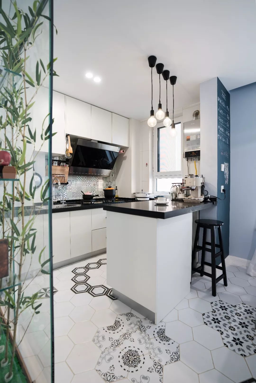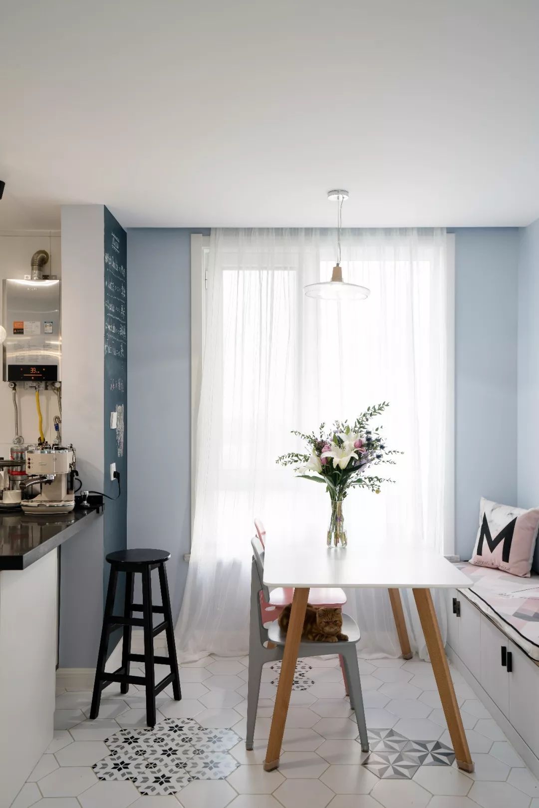 餐厅看向厨房一角,蒙娜丽莎小花砖,增添了厨房空间的活泼、文艺气息。