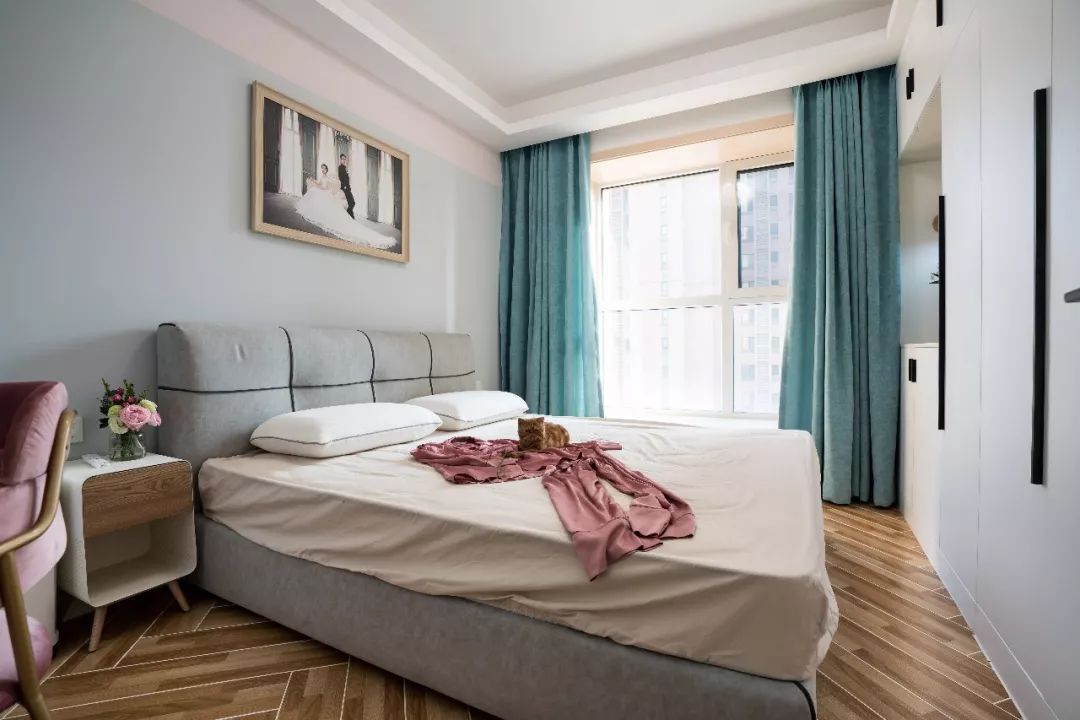 主卧仍是清新淡雅的色调。一面墙的定制衣柜解决的卧室的收纳问题。