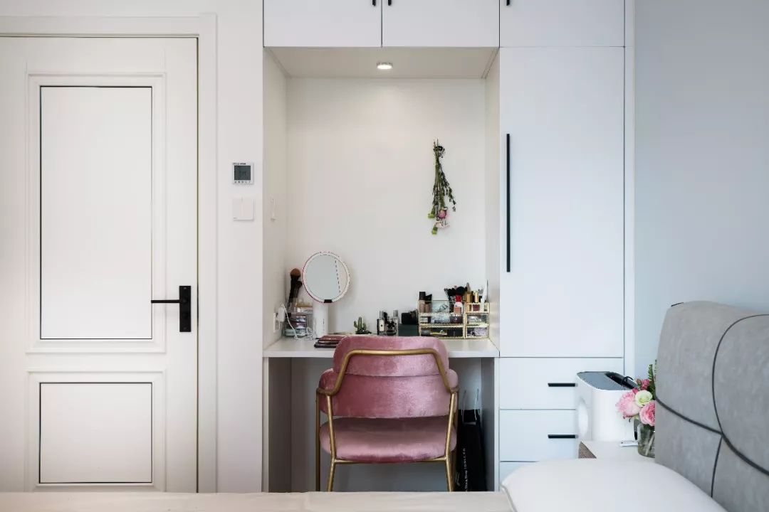 在主卧的另一侧墙面嵌入梳妆台,梳妆台正上方可以搭配5w的中性光源射灯,解决光线不足的问题,LED的射明亮又省电,右侧的抽屉和单开柜门解决了小件物品的收纳。