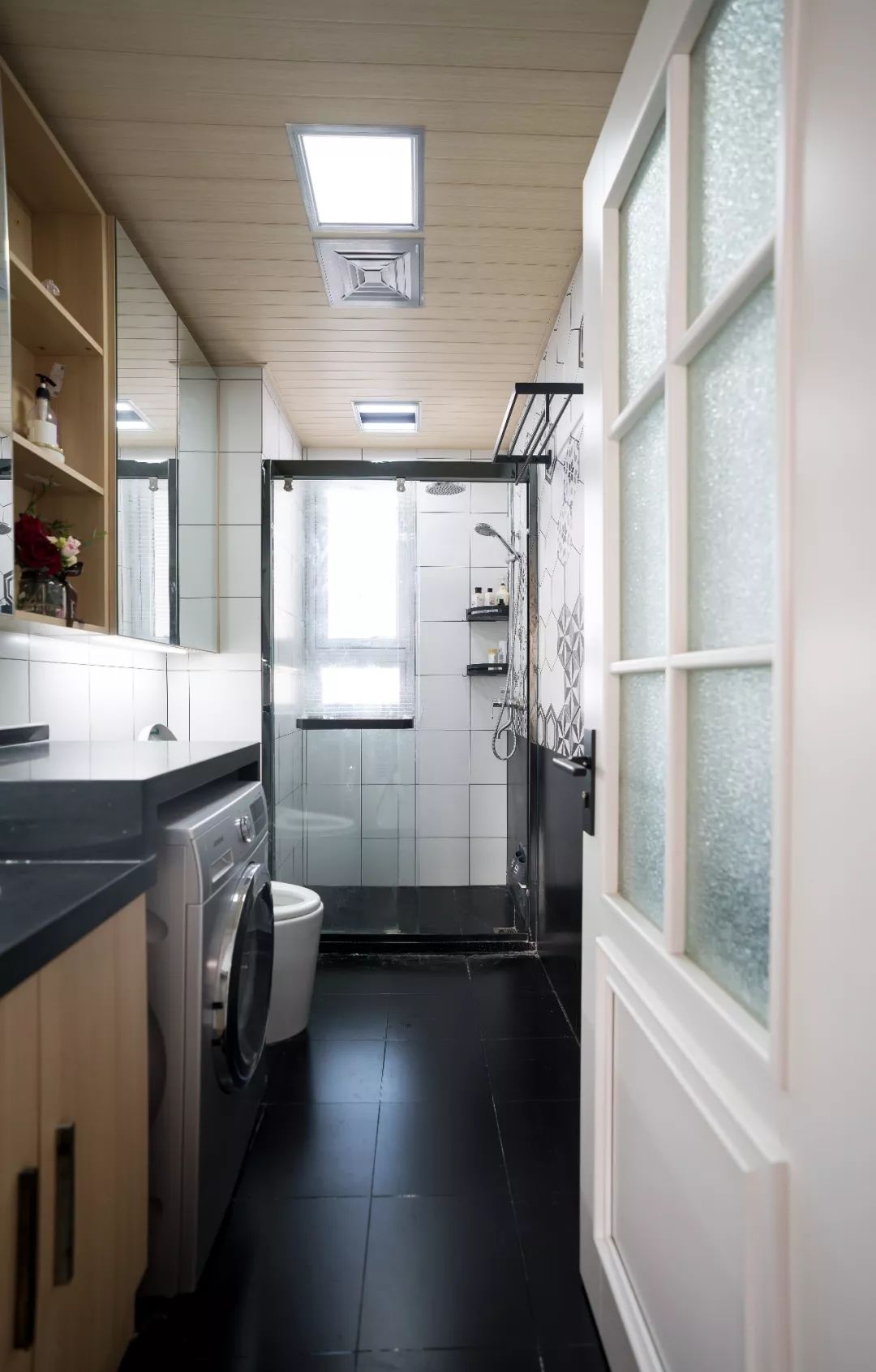 卫生间是一个比较长偏窄的空间,空间内的布局呈一字形分布。卫生间黑白色为主色,为了暖一点,加了木色的镜柜和浴室柜以及生态木吊顶。