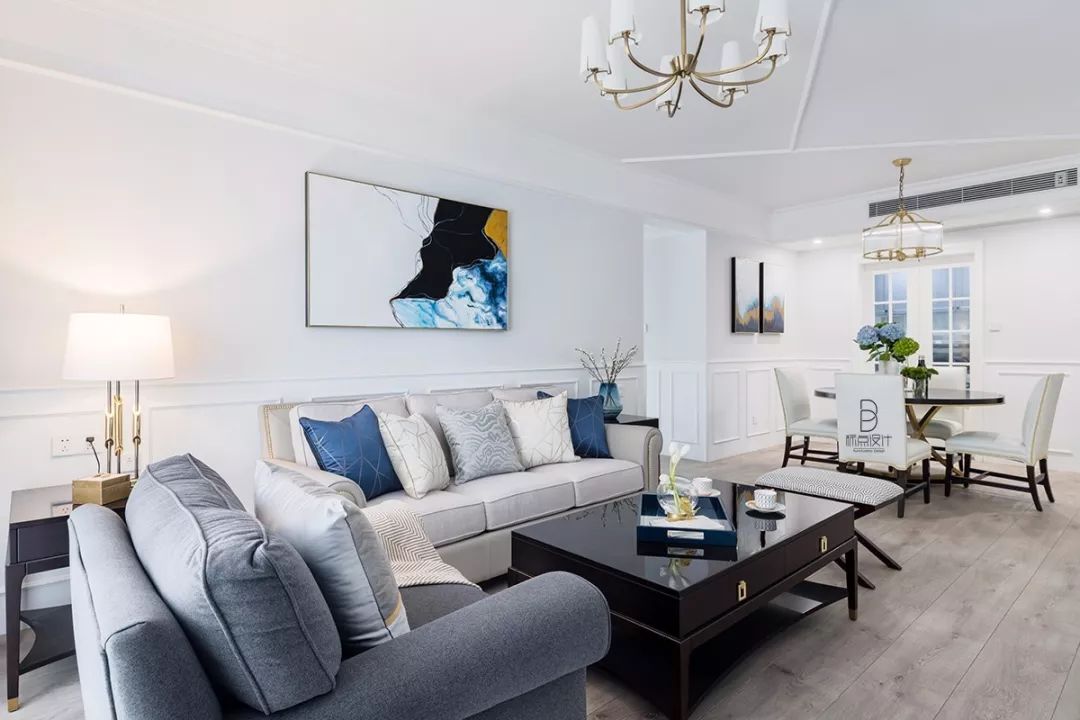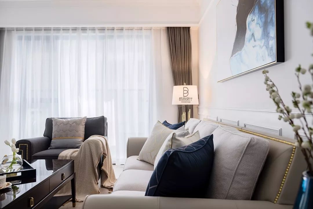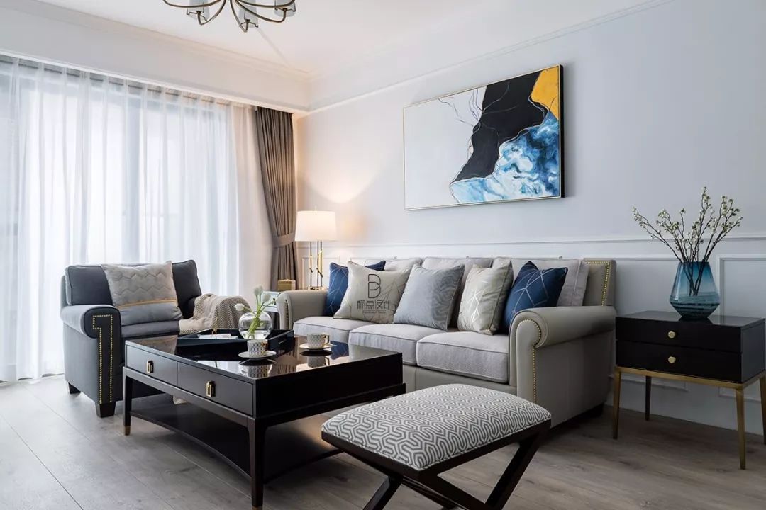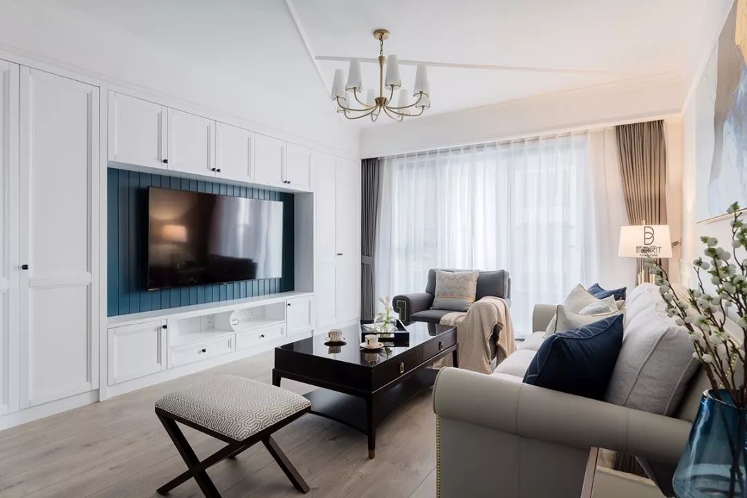 沙发墙的蓝色装饰画,与电视墙的色调相呼应,