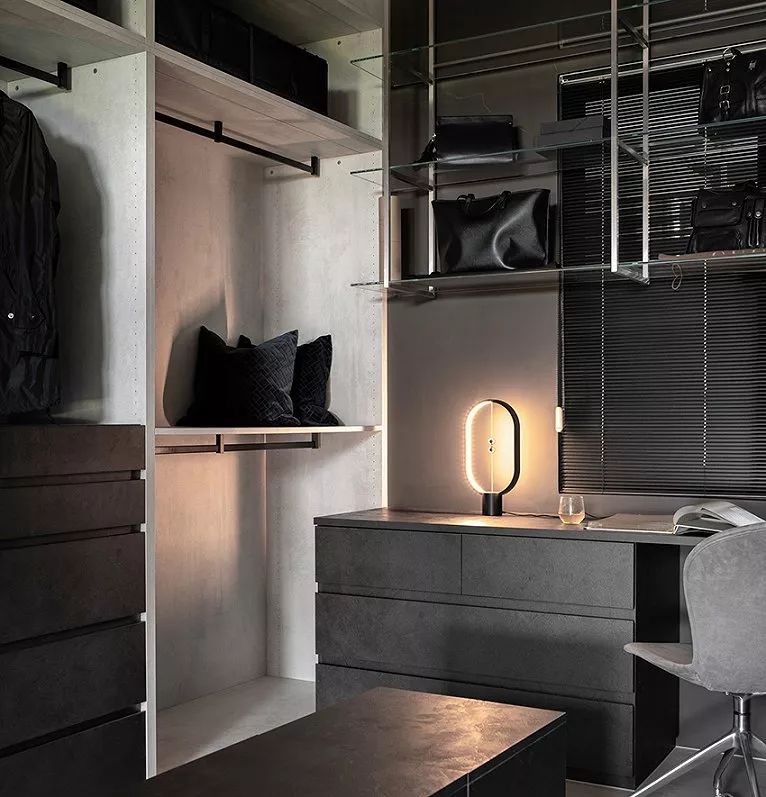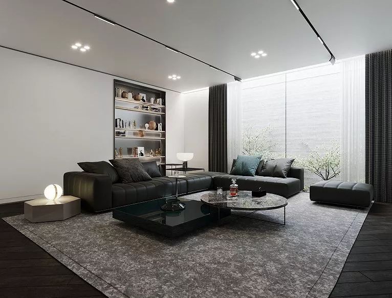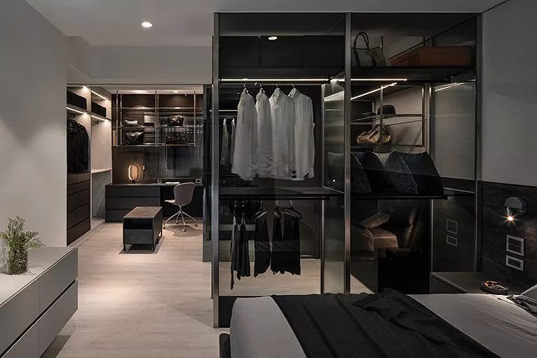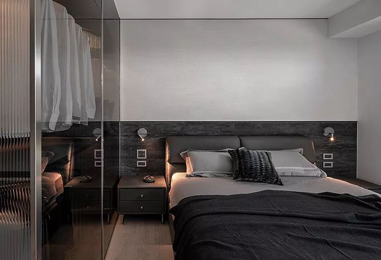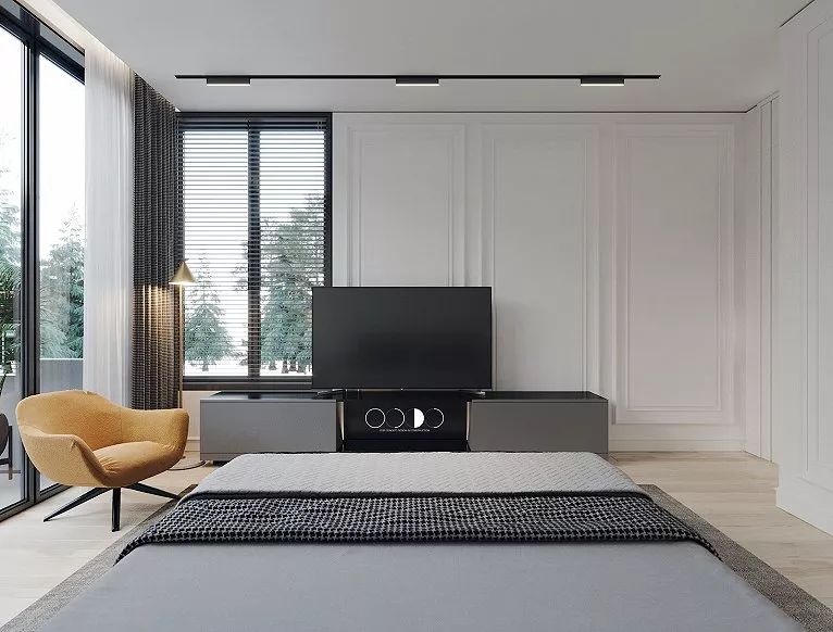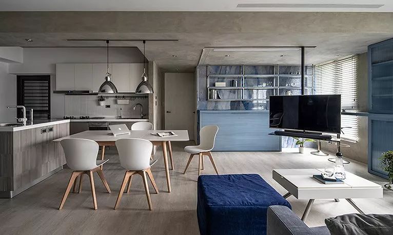 灰色裸墙与灰蓝色基调,配以各种纯度的蓝色。值得一提的是电视机安装位置,很有意思,可以360度旋转,满足各个空间观看需求。