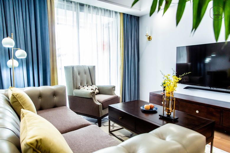 客厅以淡蓝色为基调,搭配暖色调的软装配饰,给人一种温馨舒适感。