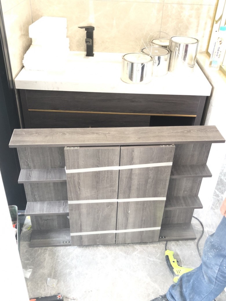 指尖微光:外卫干区的台盆柜终于来装了,不过镜柜的颜色和下柜明显不同,又得等下次来装。镜子做的是风水镜,因为对着房门。[图片][图片] (2020-05-10 19:45)
