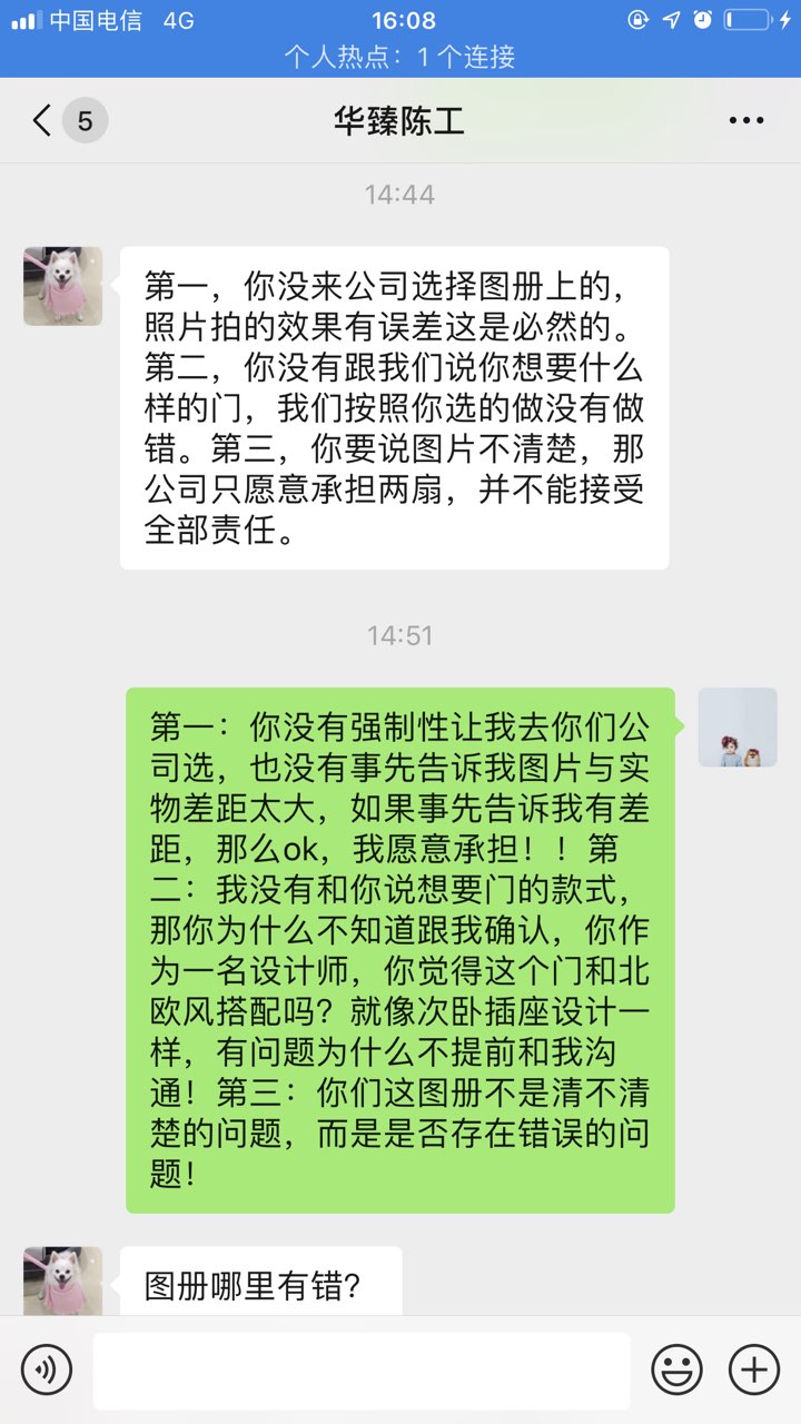 是这样的,当时需要选卧室门款式的时候,这家装修公司的设计师发了一个图册给我选,我选的是图画圈圈的这个款式,各位网友们,你们觉得我选的这个款式是有花纹的吗?反正我觉得是没有的,结果他们给我装的是图二的款式,当时沟通过之后又给我换成图一没有花纹的款式,结果现在结账的时候,他们装修公司想让我们业主承担一扇门的费用(一共三扇),对此我肯定是拒绝的,但是他们设计师一直强调我选的图就是有花纹的款式!声称他们并没有做错,下面接几张图给大家看看我们的聊天记录!