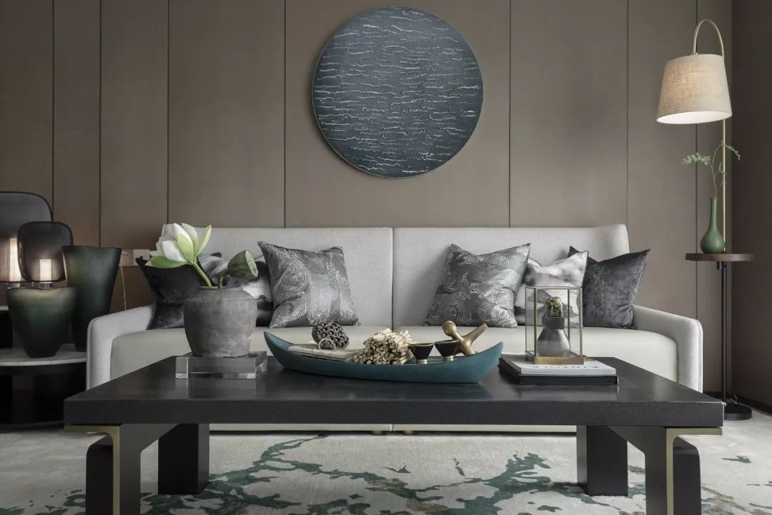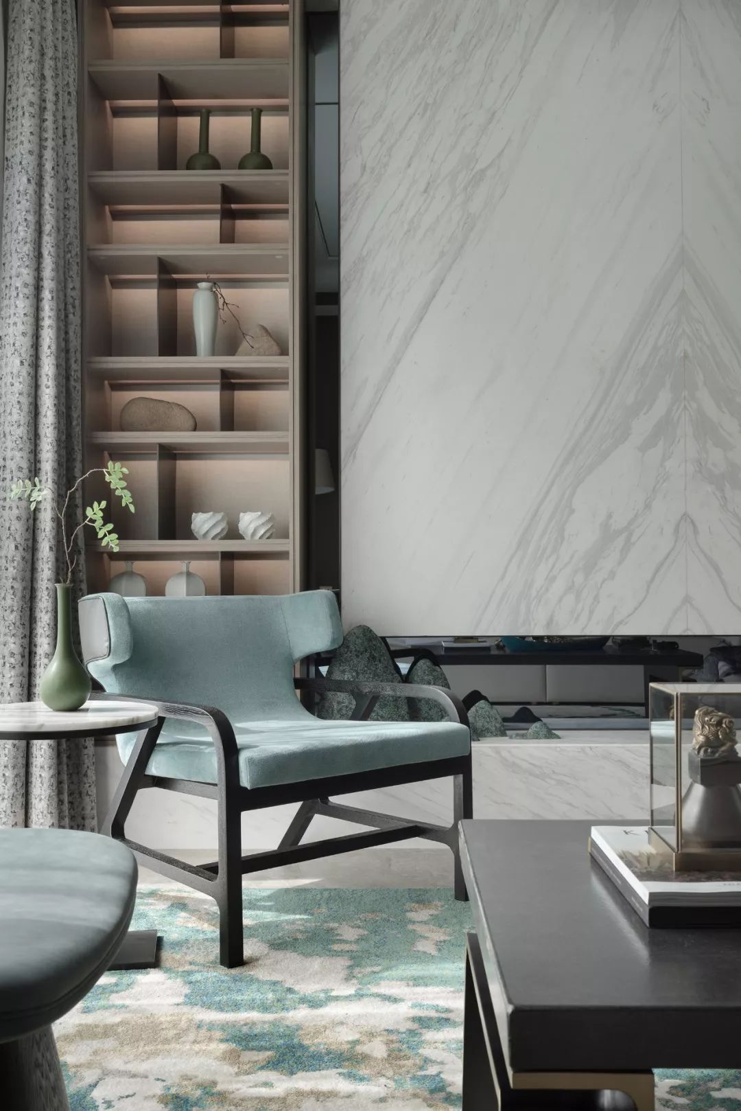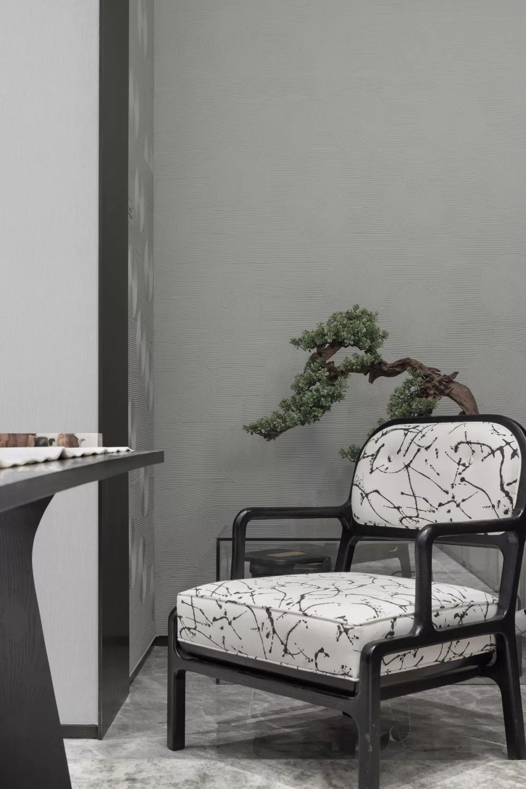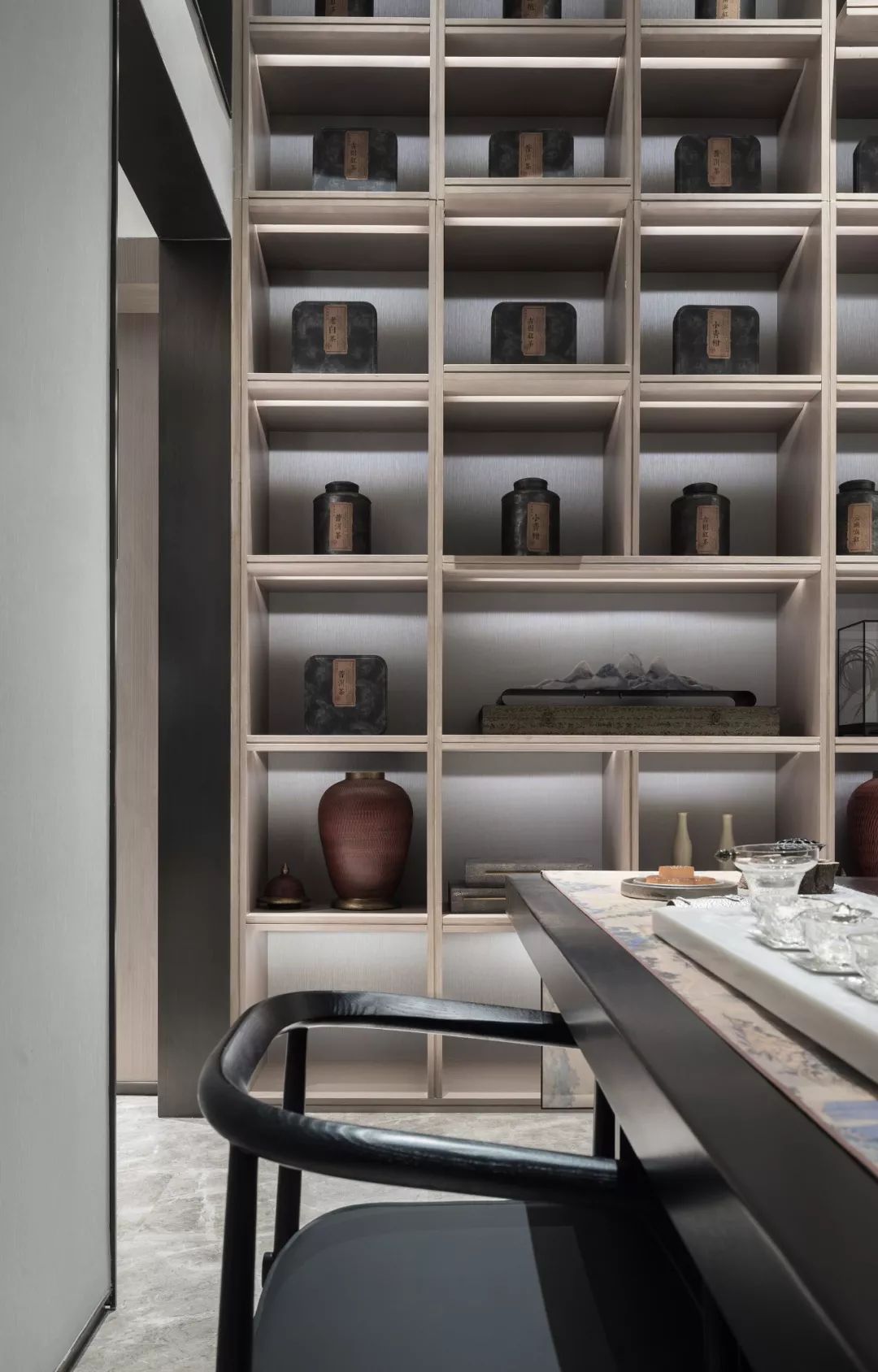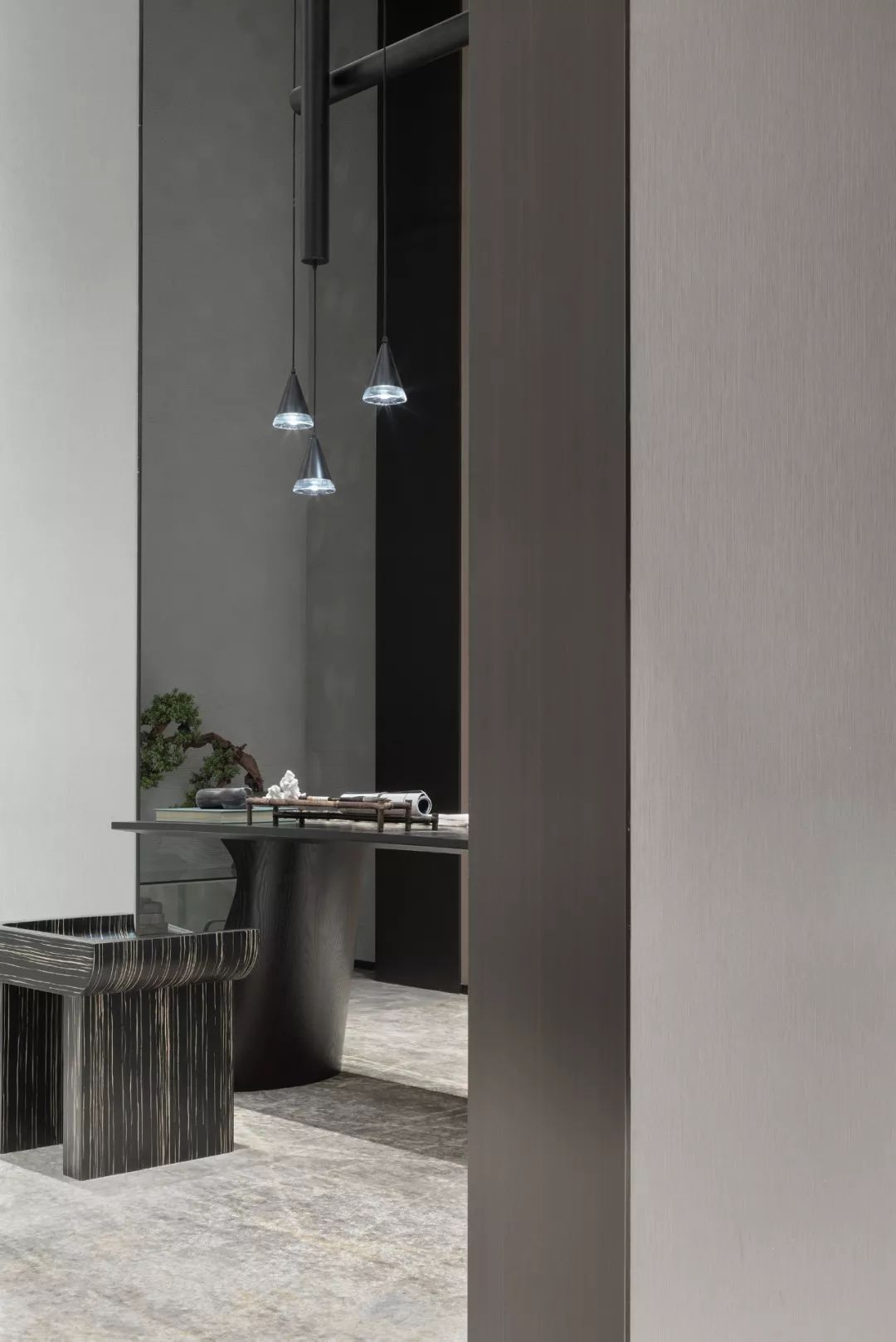 推门而入,幽雅的灰蓝色调与水墨意象穿映于其中,涟漪、岛石、风荷、夏莲、扁舟、纱帘、清透的瓶樽等不同元素在空间中悄然衬托,空间给人的观感似是在泛舟听湖。