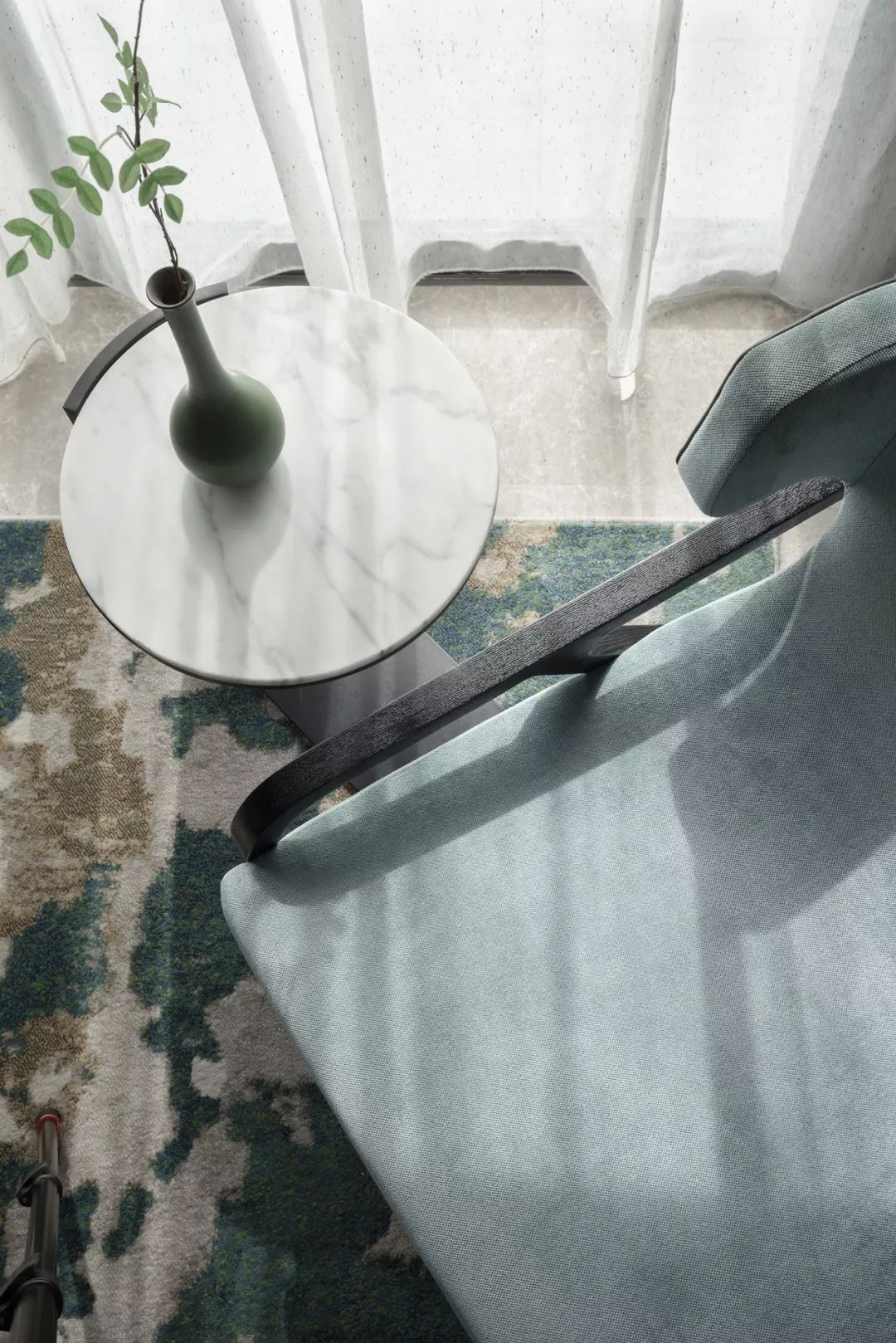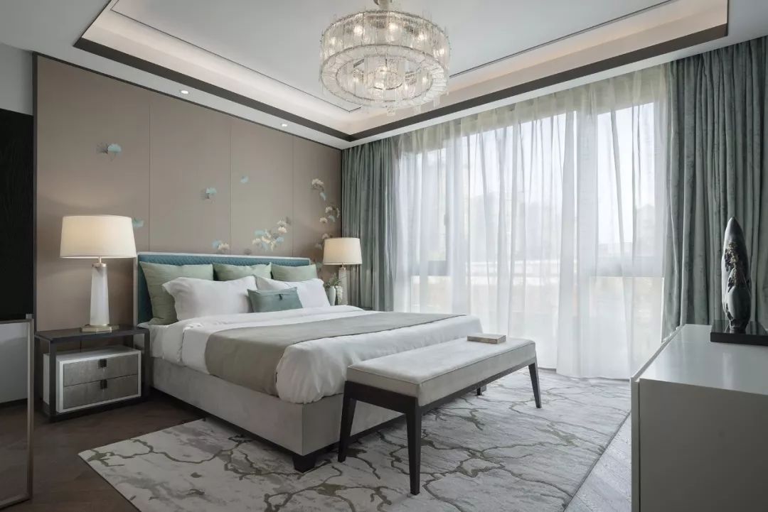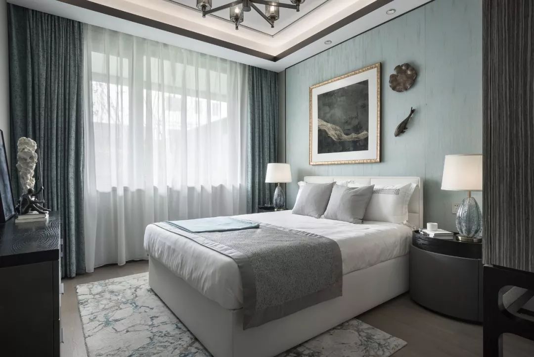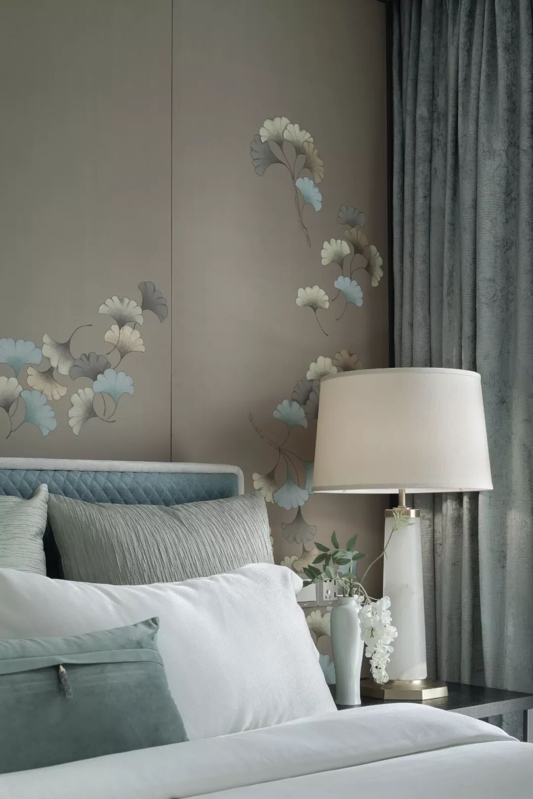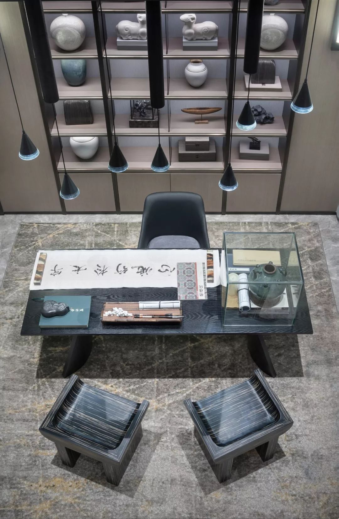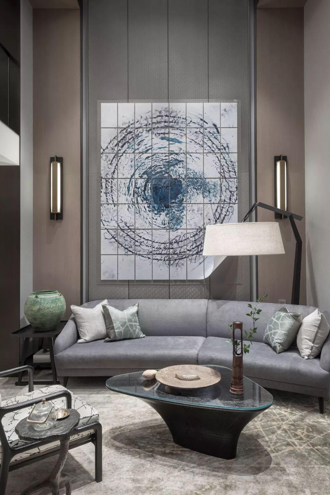 推门而入,幽雅的灰蓝色调与水墨意象穿映于其中,涟漪、岛石、风荷、夏莲、扁舟、纱帘、清透的瓶樽等不同元素在空间中悄然衬托,空间给人的观感似是在泛舟听湖。