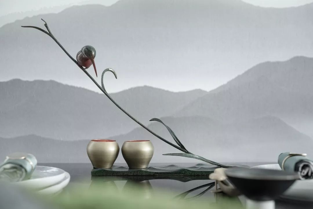 一碗一碟,一杯一盏,布景出泛舟湖上的每个生动的细节——扁舟与桨,莲叶与鱼,还能瞧见吱吱喳喳的雀在芦苇尖上稍作歇息,场景的生趣盎然跳跃在画面上。远处的山峦叠影,邈远宁静,动静相宜,观照着人的内心,洗去生活间隙里的一些浮躁。