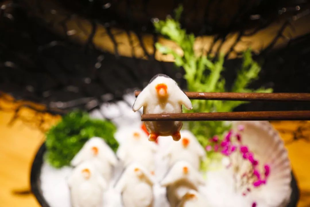 圆鼓鼓胖墩墩的小企鹅们,整齐的排列在盘子里,每只都敲可爱!偷偷告诉你,其实TA是由墨鱼滑制作而成的喔~