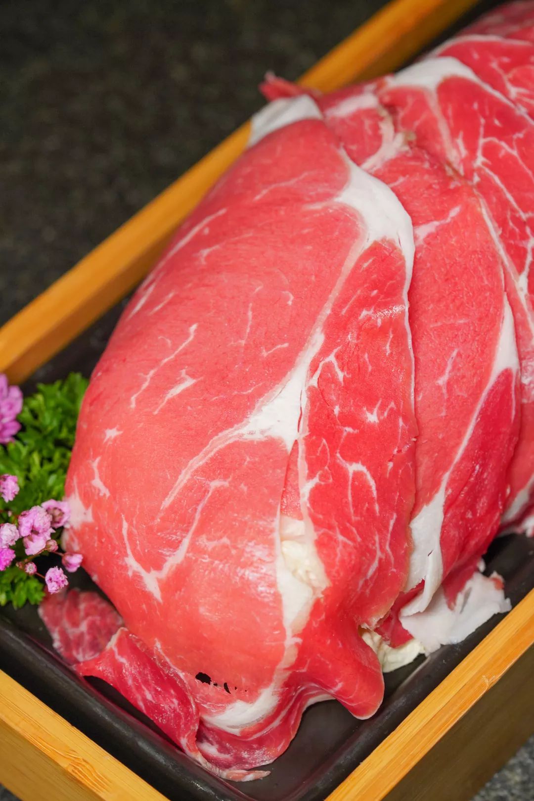精选澳洲谷饲牛肉最鲜嫩可口的部位,每一片被切得均匀细薄,看它身上密布的雪花纹,每一口都是精华!