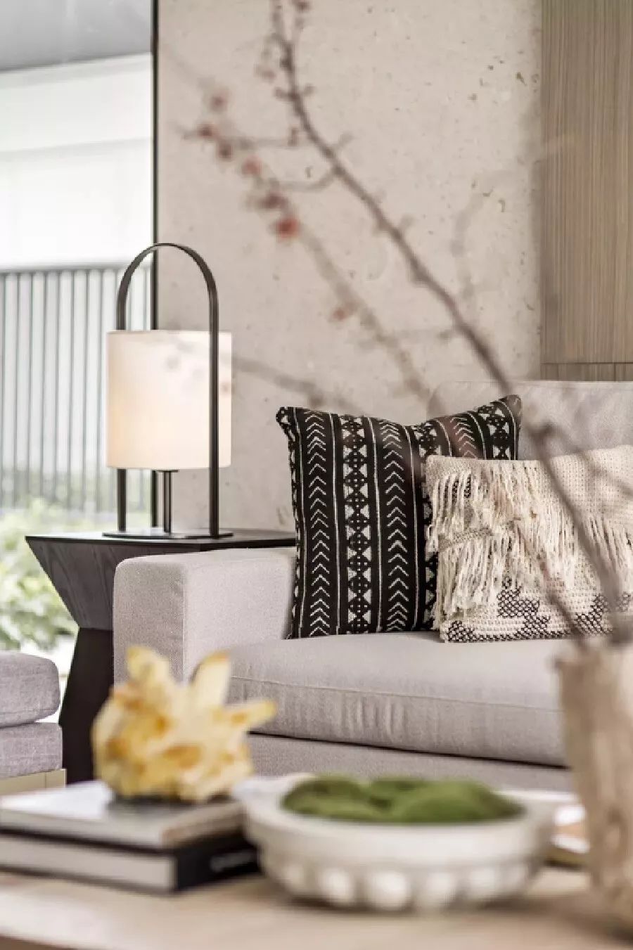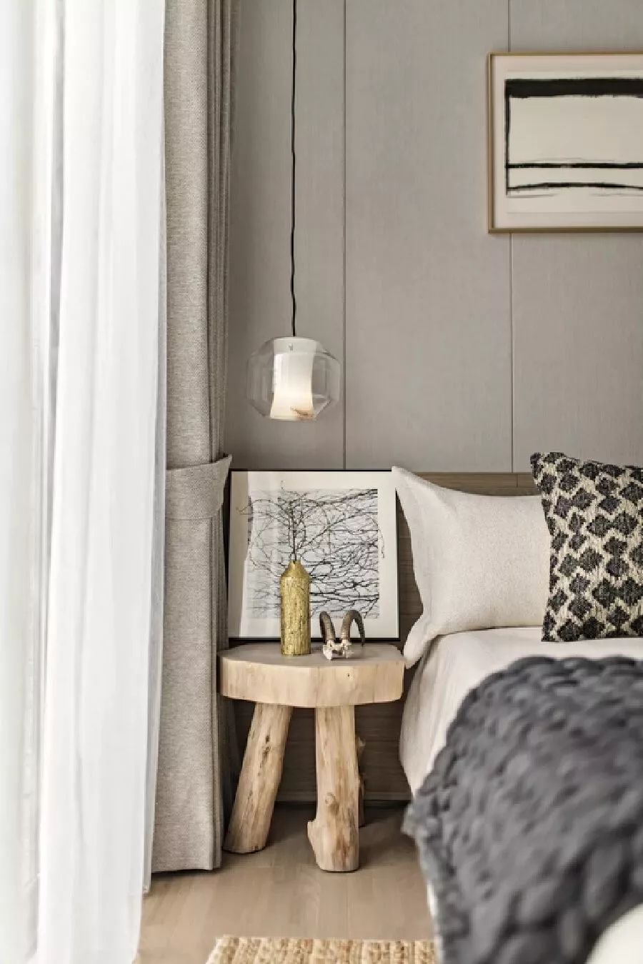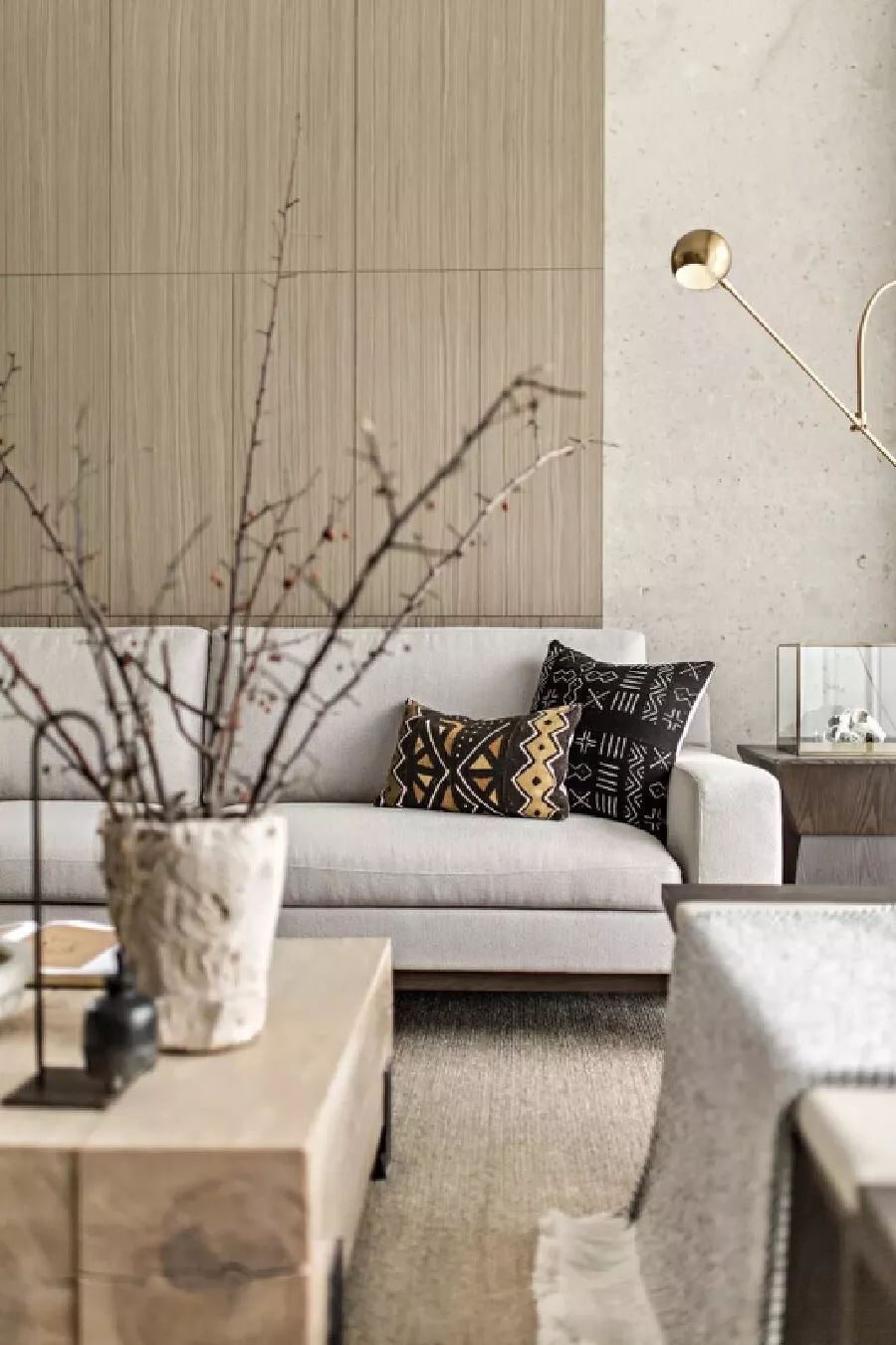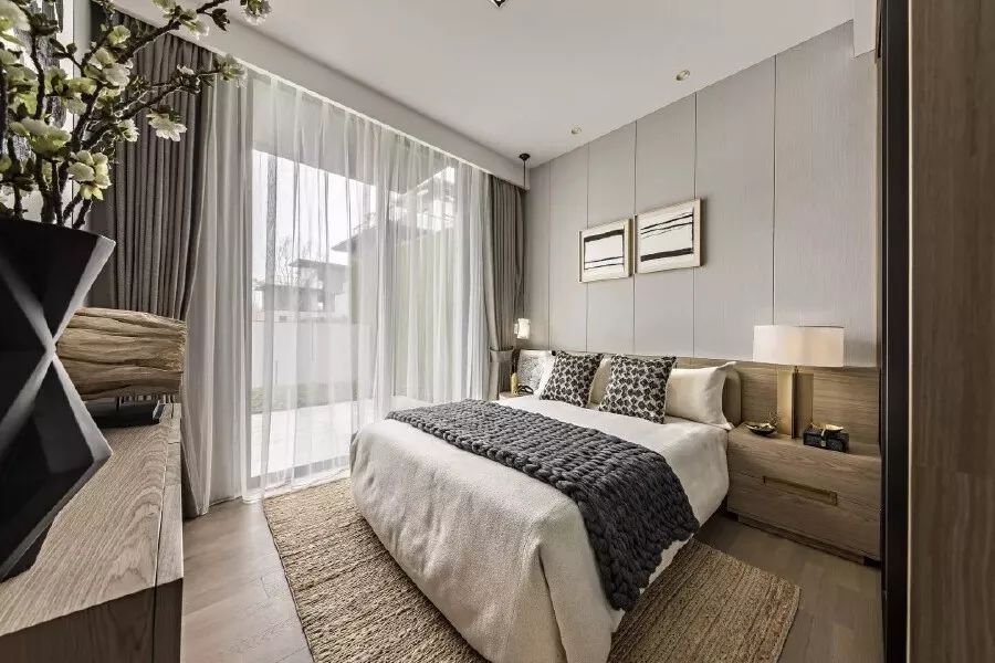 本案以浅色木饰面为基调,搭配墙面富有自然肌理感的石材,干净而通透的玻璃屏风,联结不同维度的江景,增加空间通透度和仪式感,意在有限的空间中打造舒适、宁静,并富有禅意感的生活方式。