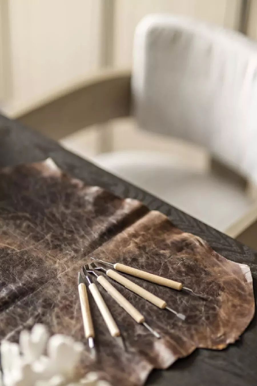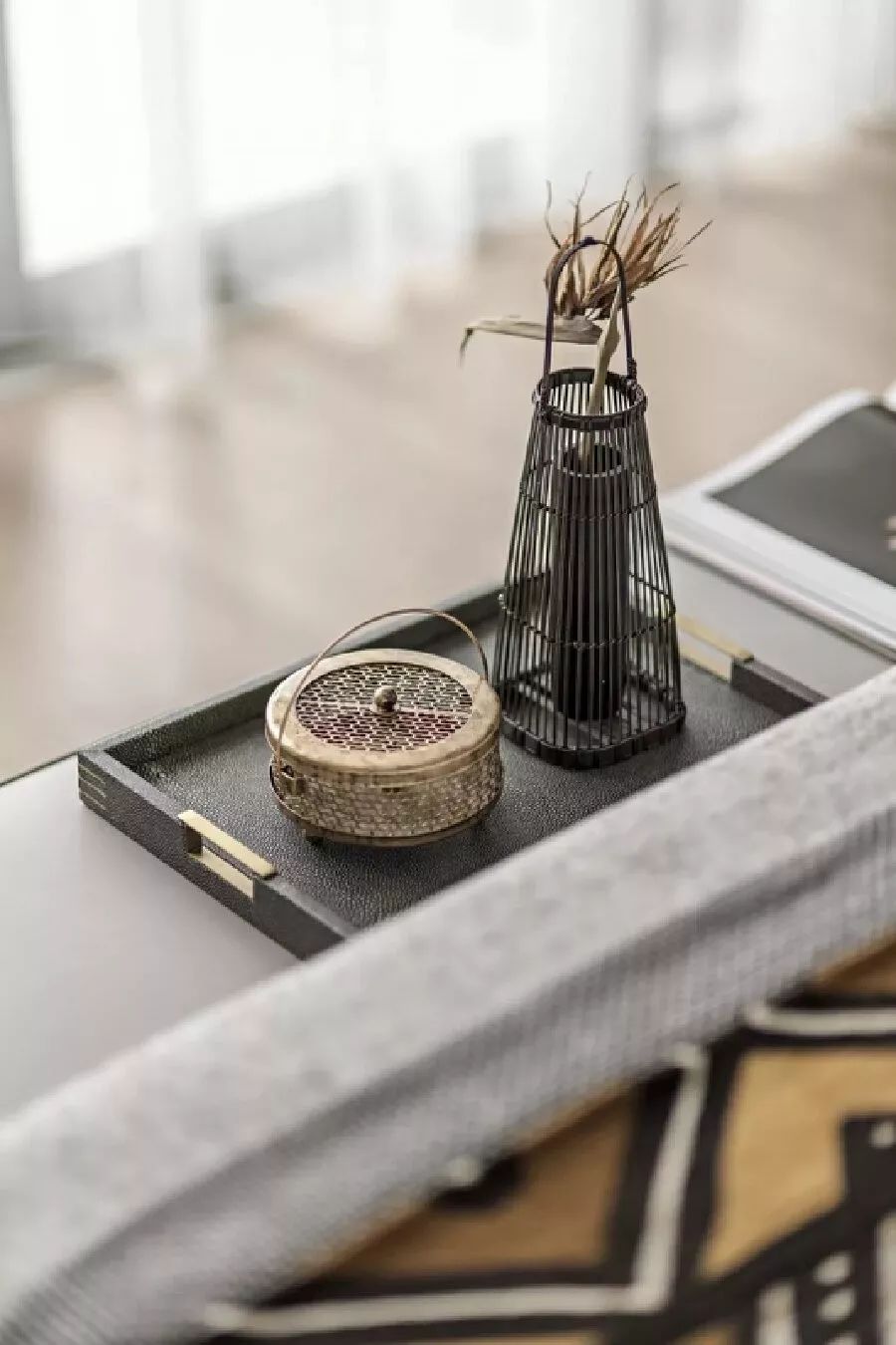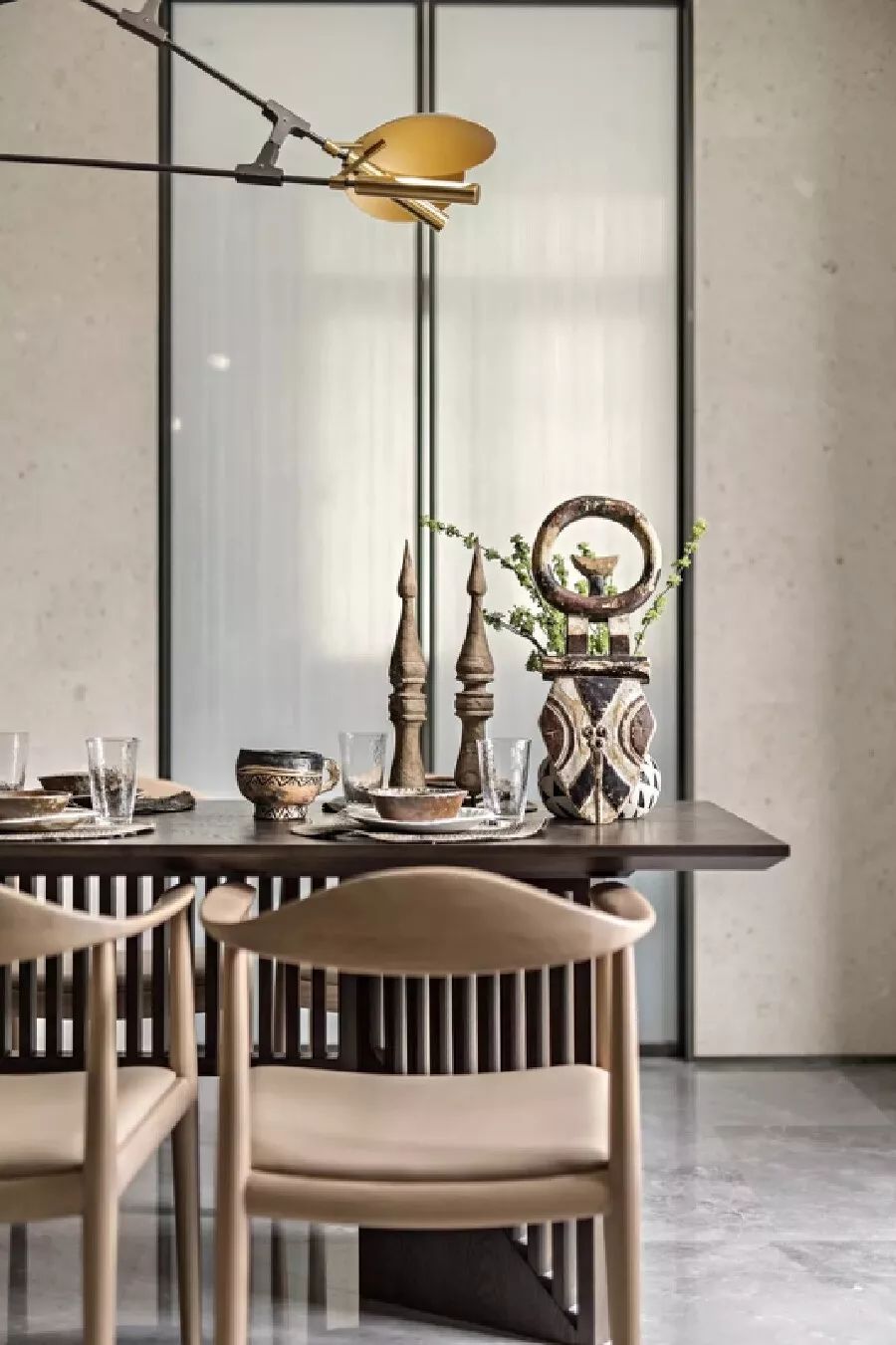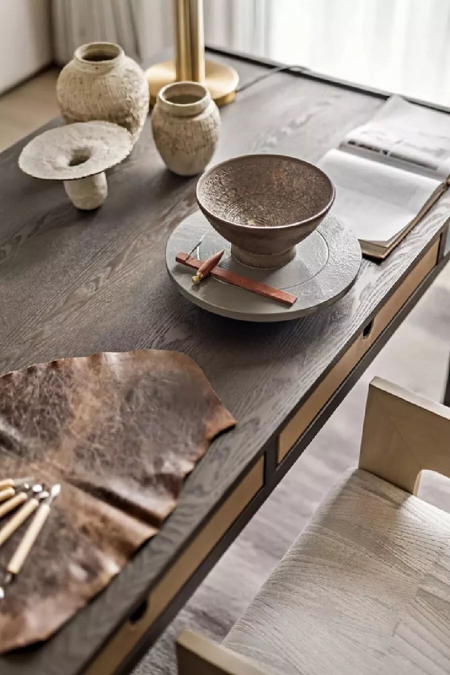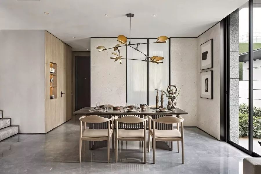 大片的自然木色为主调,温和的浅灰稍稍点缀,结合大理石和木材的自然纹理走向,让空间背景兼顾美观舒适,并植入安静纯粹的精神观感。东方的木几、瓷器、水墨画和现代的金属框格、灯饰、摆件,在“虚与实”、“显与隐”间相互作用,形成具有东方禅意的视觉张力。
