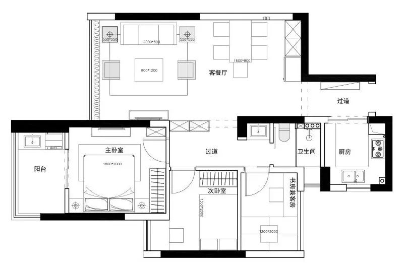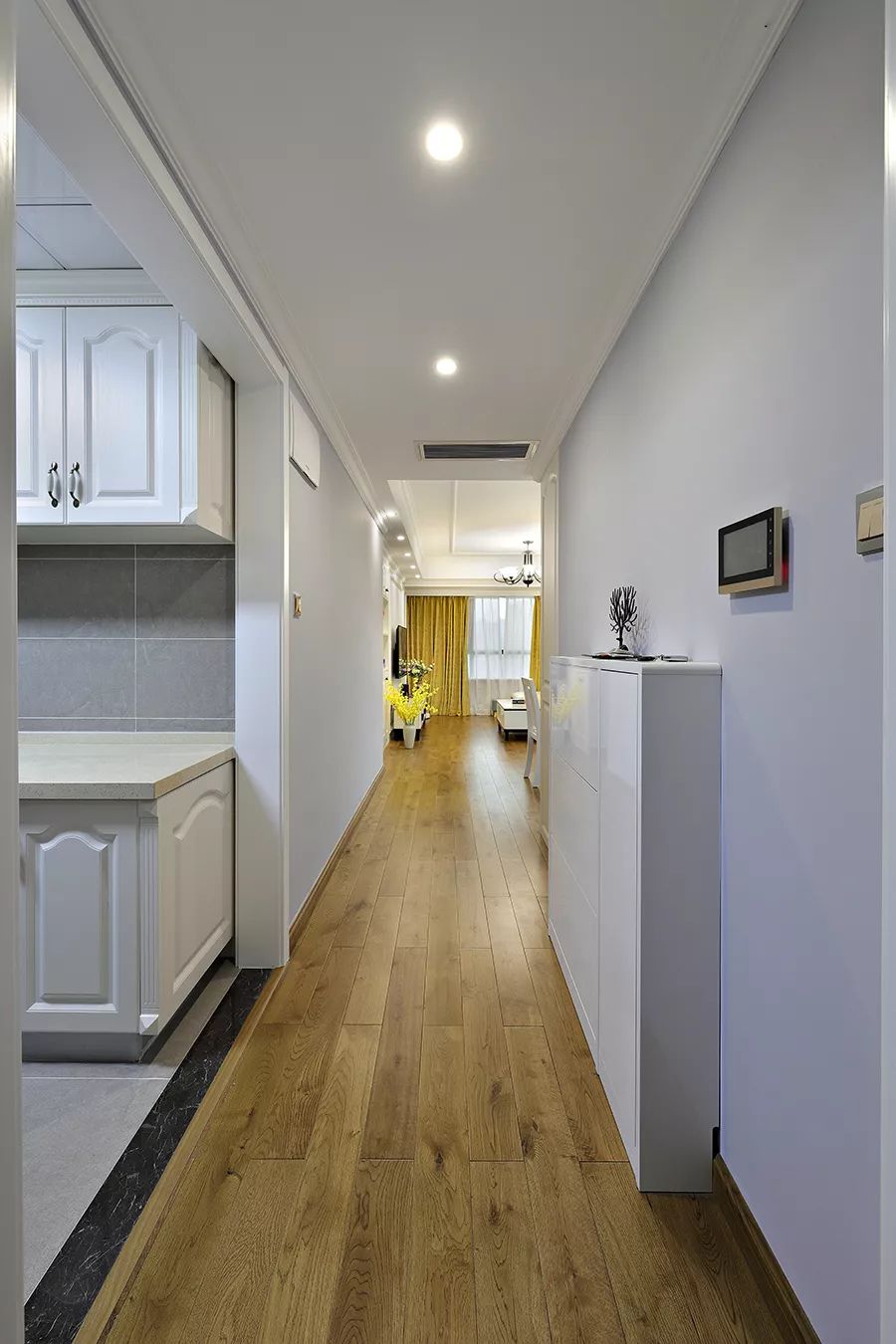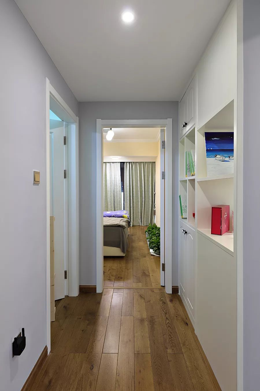 通往卧室的走道,用柜子来代替墙面,嵌入式的柜子设计让走道多出更多的收纳空间,又不会让人觉得太过狭窄。