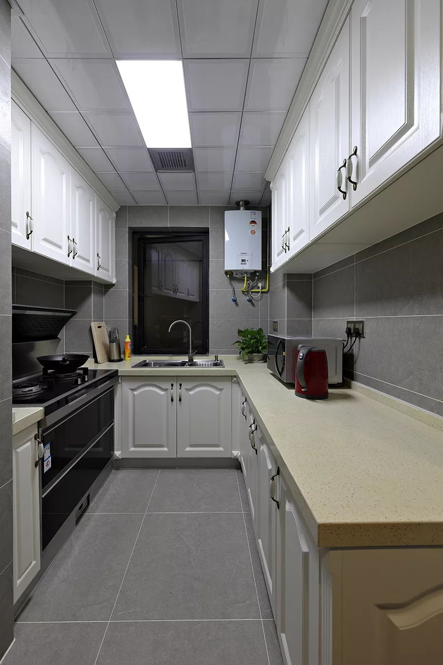 玄关的侧面就是厨房,半开放式的厨房,而且还有窗户,其实油烟问题不大。U字型厨房的收纳设计非常多,橱柜和吊柜都可以做在两侧。