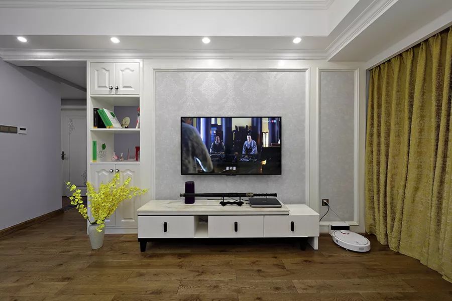 电视背景墙的设计非常的简单,浅蓝色的壁纸搭配石膏线条,以后想要更换也方便一些。电视背景墙边上还做了隔断收纳柜,更加实用。