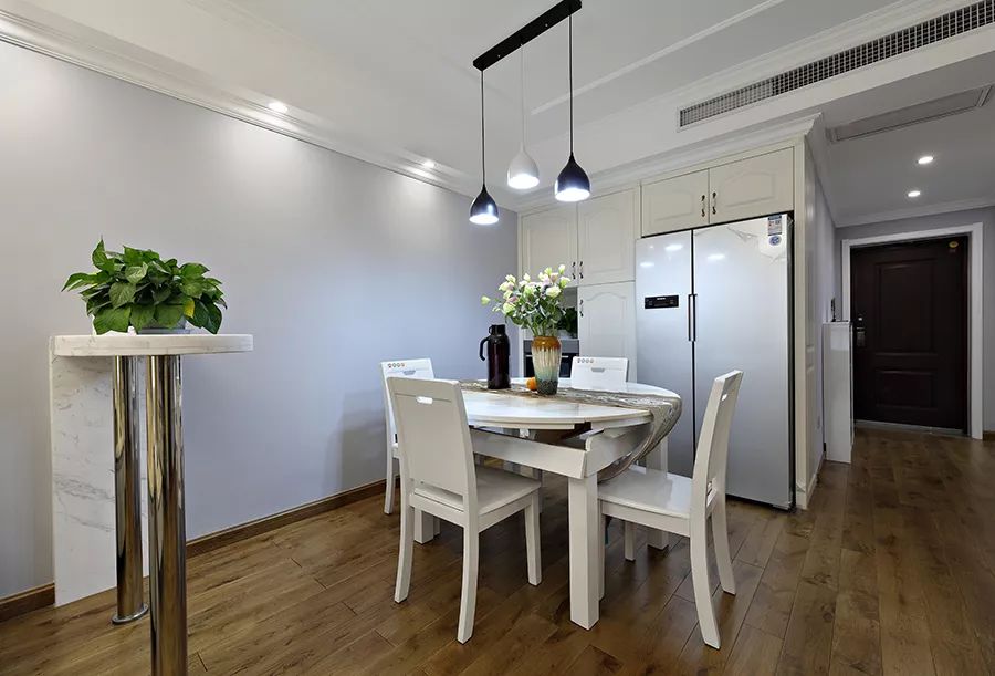 餐厅的空间还是比较宽敞的,选择圆方两用的餐桌,更加实用。把冰箱和柜子做在了一起,嵌入式的到顶柜子看起来也更舒服。