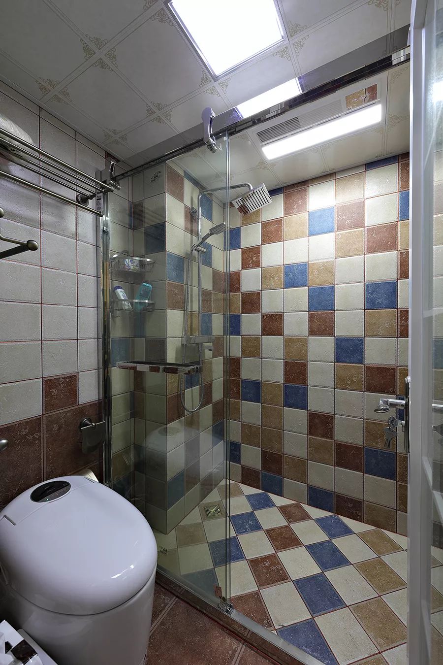 卫生间干湿分离,淋浴房内用仿古砖做点点缀,错落铺贴的彩色砖,也让卫生间看起来更加的有趣一些。