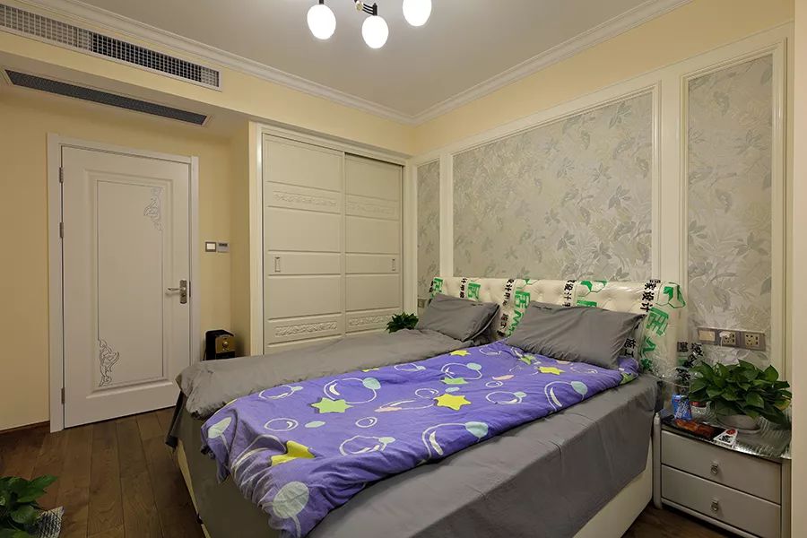 主卧的背景色选择了更加温馨的米黄色,搭配浅色系的壁纸、床品等,整体给人的感觉就是温馨而又舒适。