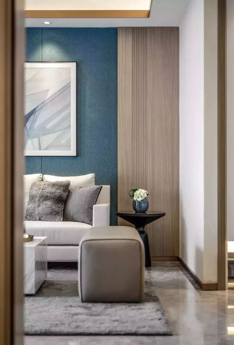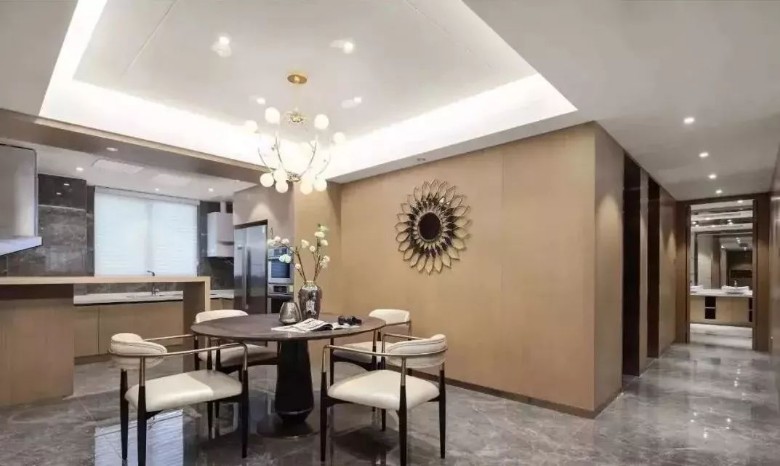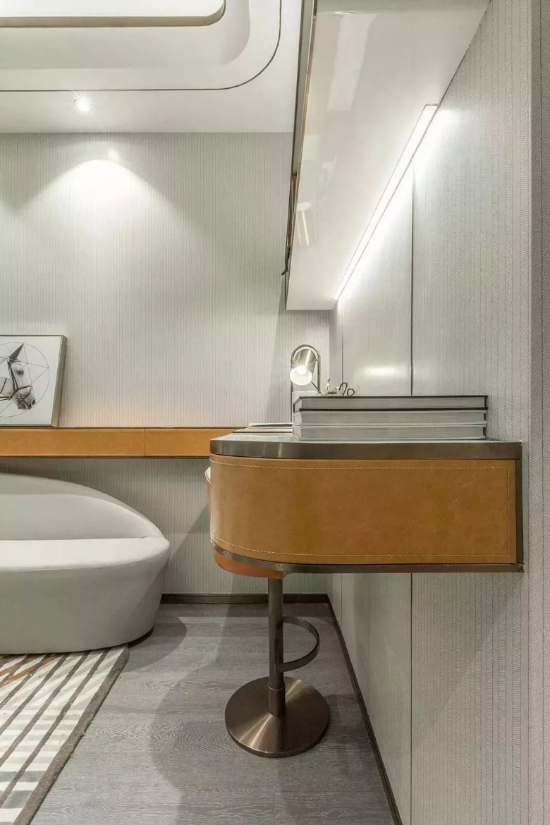 金属质感踢脚线与地砖搭配,结合轻奢风格的金属质感家具,呈现出一个轻奢档次的品质空间。