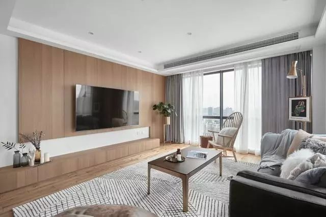 通铺暖色木地板,电视背景墙也是用木饰面板打造的,长长的电视柜也是定制的,与背景之间留白,形成错落的层次感。