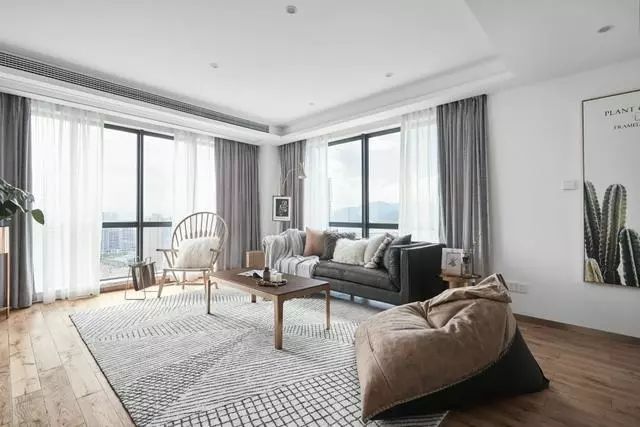 两扇的落地窗,通透异常。宽敞通透的客厅空间,搭配简约的家具, 感觉那么的轻松自在,悠闲惬意。
