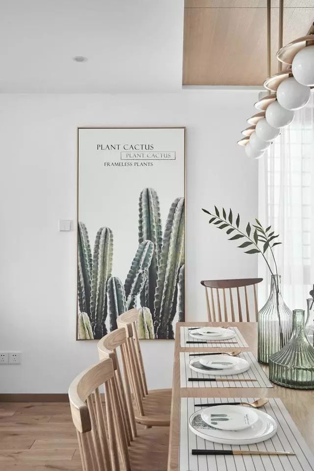 餐厅以一幅仙人掌画为背景,细心的你也许会发现,餐具上的图案也是仙人掌,自然有活力。