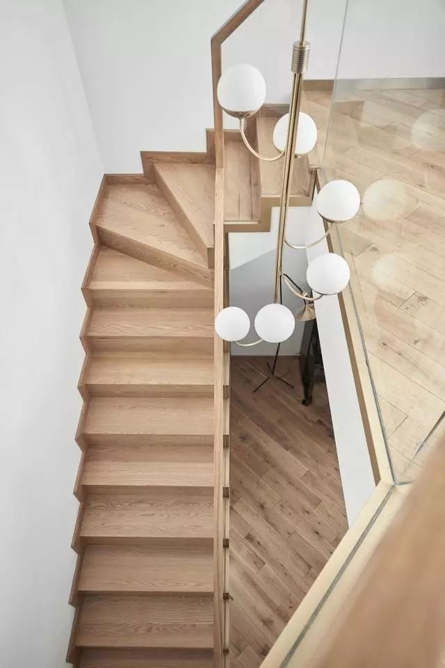 楼梯空间,相对而言,是一个单独的空间。保留通透性的前提下,楼梯栏杆设计为清玻搭配实木扶手。