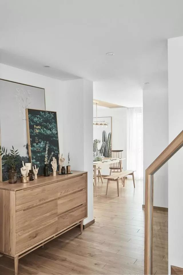 白色和原木色从一楼延伸至二楼主卧,整体统一融合,效果温馨舒适。