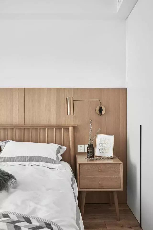次卧与整体风格一致,木饰面半墙床头设计,看去更加舒适有格调。