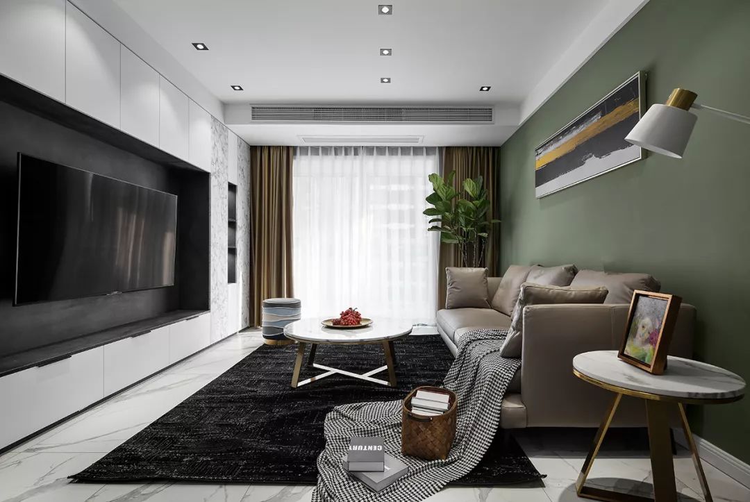 位于入户门一侧的是客厅空间,客厅的电视背景墙做了满墙的定制柜设计,电视周边的空间选择了黑色调,让电视背景墙的层次更为分明。