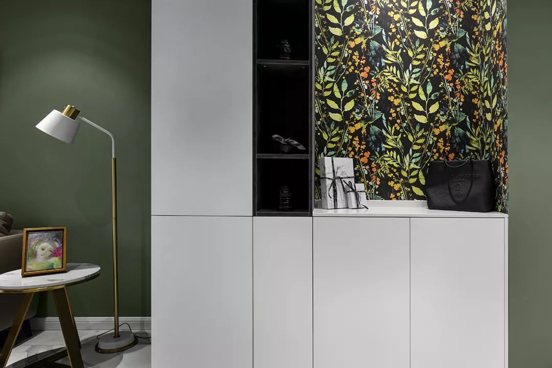入户门对着墙面,设计师在这做了端景台加鞋柜的组合式设计,白色的柜子搭配黑色的搁架,再加上多彩的绿植图画,让人感觉很有格调。