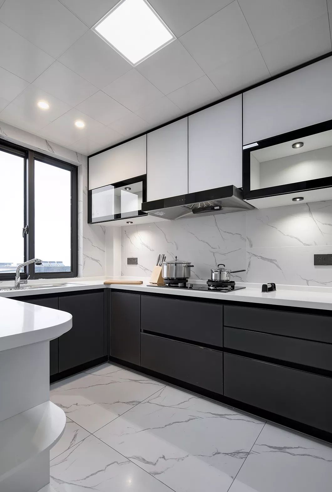 厨房内部的空间还是比较宽敞的,U字形的橱柜布局方案带来更短的厨房动线,也拥有更多的储物空间,橱柜转角做了弧形搁架的设计,既安全又实用。