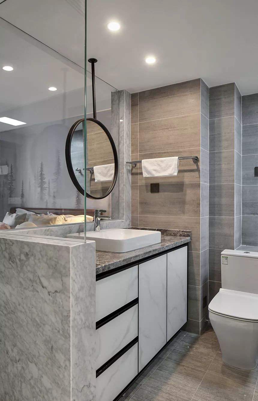 主卧室内的卧室和卧室之间选择了用玻璃加半墙作为隔断,通透的设计让空间更显宽敞。灰色调的大理石和白色的浴室柜结合,带来简洁大方的感觉。