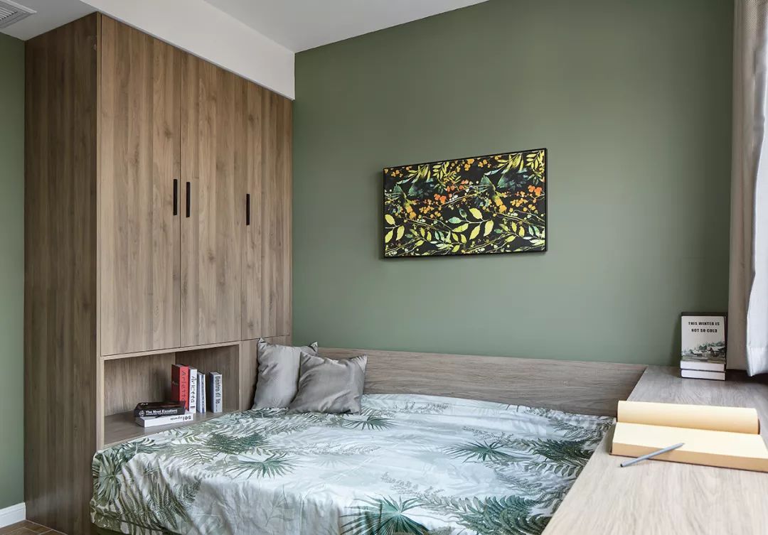 次卧也被作为一个工作区来使用,设计师在靠窗的位置做上了长书桌,榻榻米加上衣柜的组合式设计,让空间被有效的利用起来。