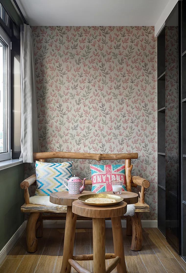 在次卧内还有一个迷你的阳台空间,屋主在这里摆放一个复古的休闲桌椅,搭配侧方的到顶储物柜,偶尔在这里晒晒太阳、看看书,想必也是非常惬意的事情。