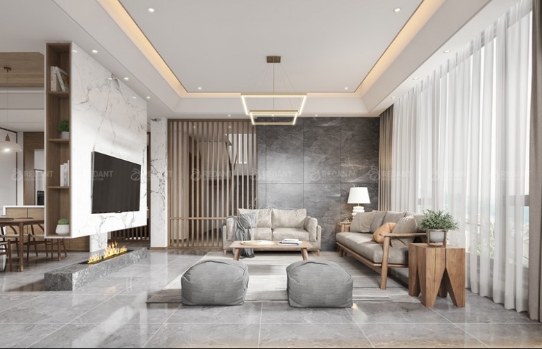 客厅使用人字形地板铺贴,在视觉上有拉伸空间的效果。厨房使用玻璃拉门,将阳光引入,整体通透明亮。