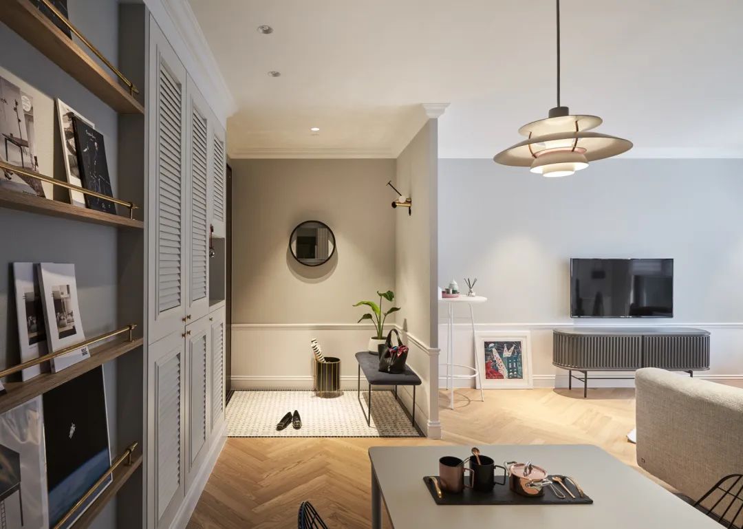 玄关墙面位置挂上一个圆镜,摆上换鞋凳与雨伞篓,摆上绿植装饰,呈现出一种清新自然的回家仪式感。