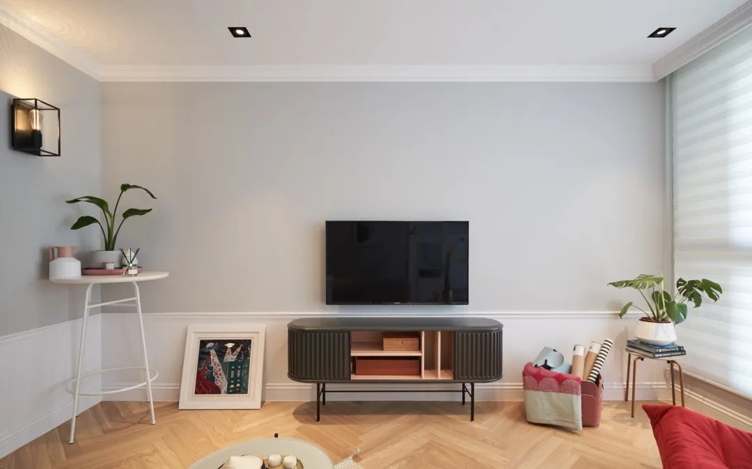 电视墙简洁的墙面基础,墙脚以护墙板的装饰,布置独特造型的电视柜,还有精致清新的绿植装饰,让空间显得充满简洁自然的舒适感。