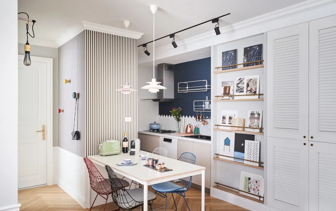 餐厅与厨房以开放式的格局,简易的餐桌搭配红黑蓝白的铁艺镂空餐椅,也让用餐空间显得更加时尚精致。
