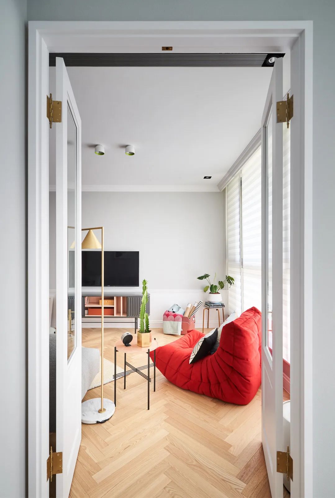 浅灰色布艺沙发+红色的时尚懒人沙发椅,结合两个托盘小茶几,让空间充满简洁的北欧范气息。
