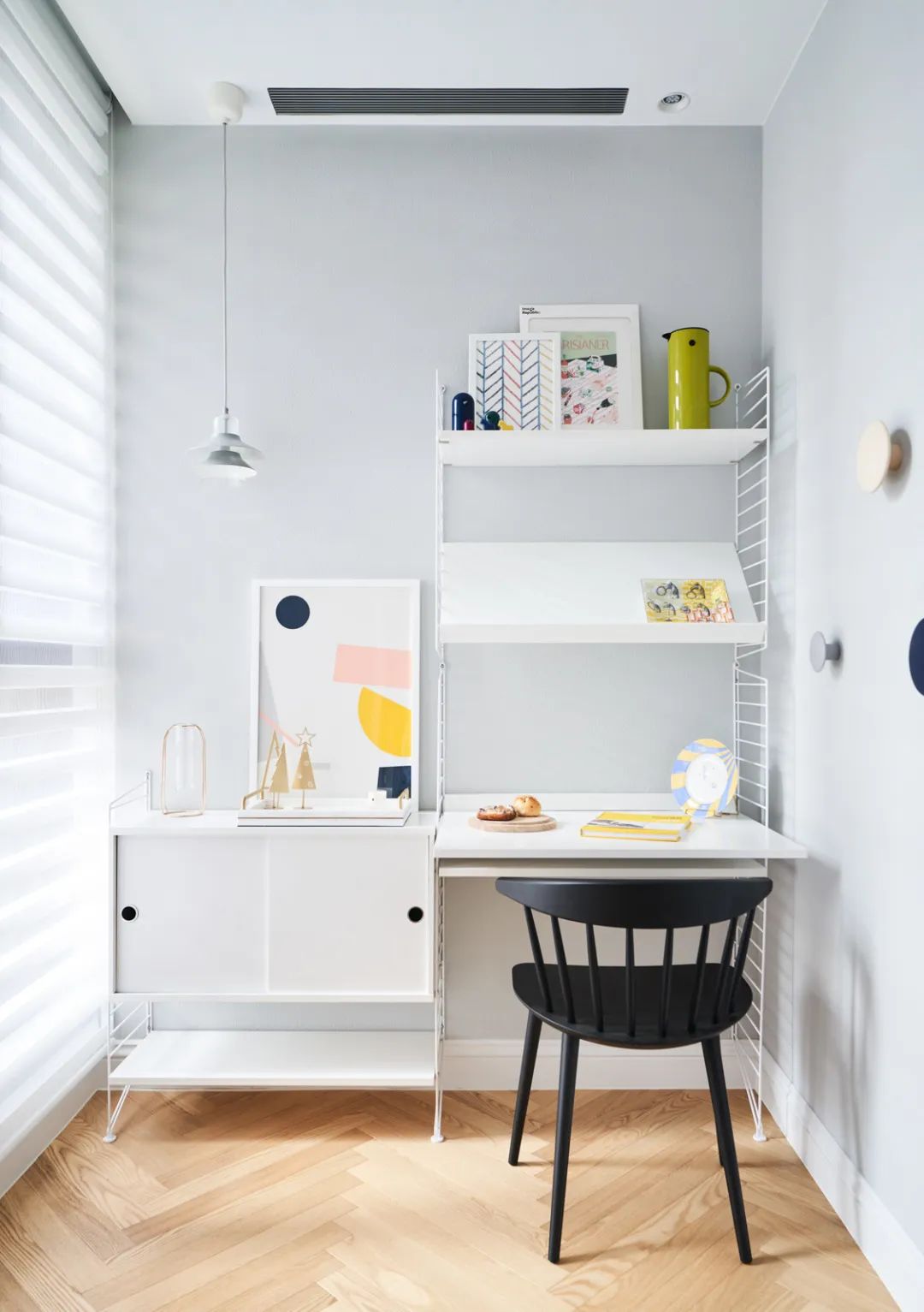 简易的书桌与收纳架,摆上鲜艳活泼的装饰画与装饰品,也让空间显得更加文艺精致。