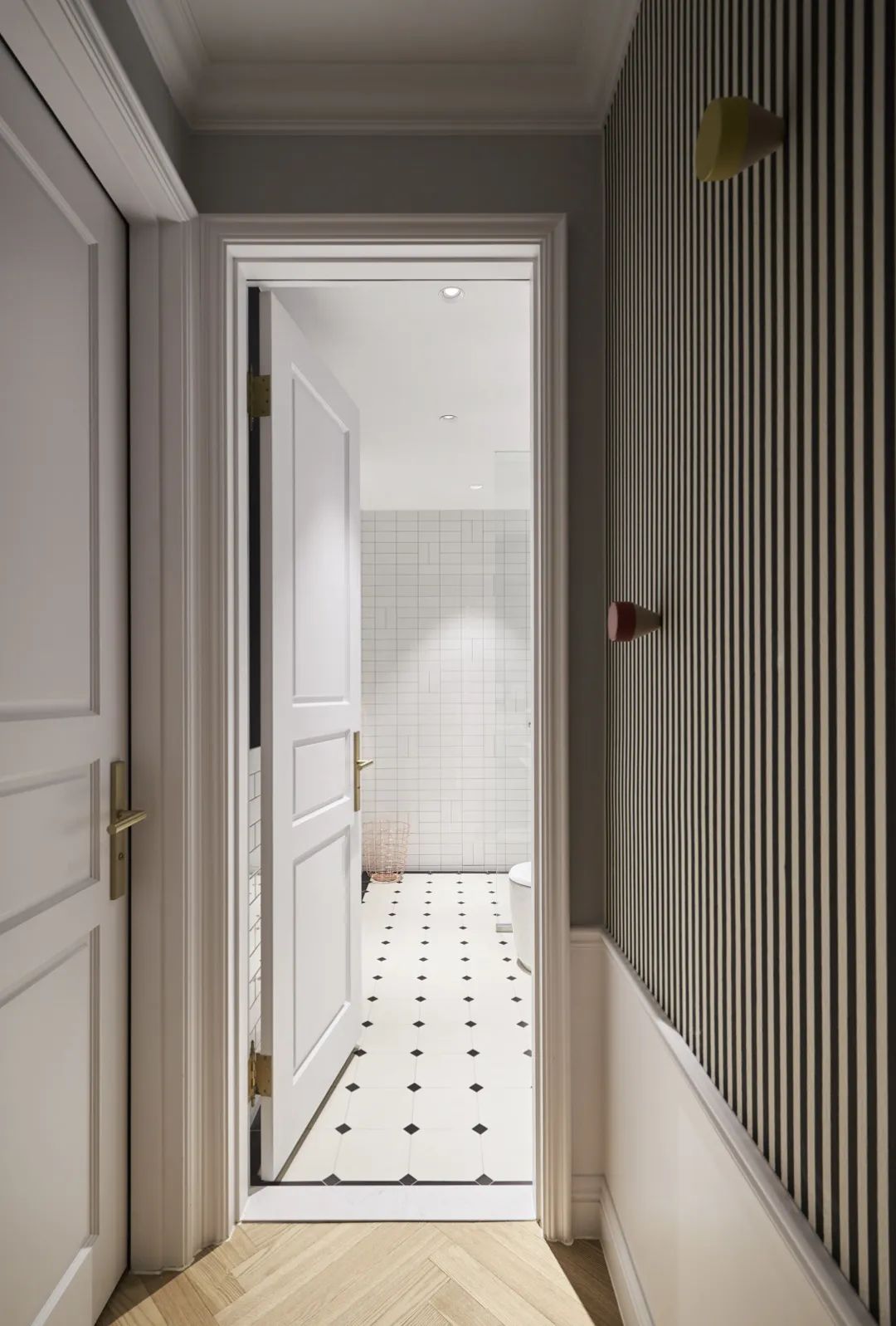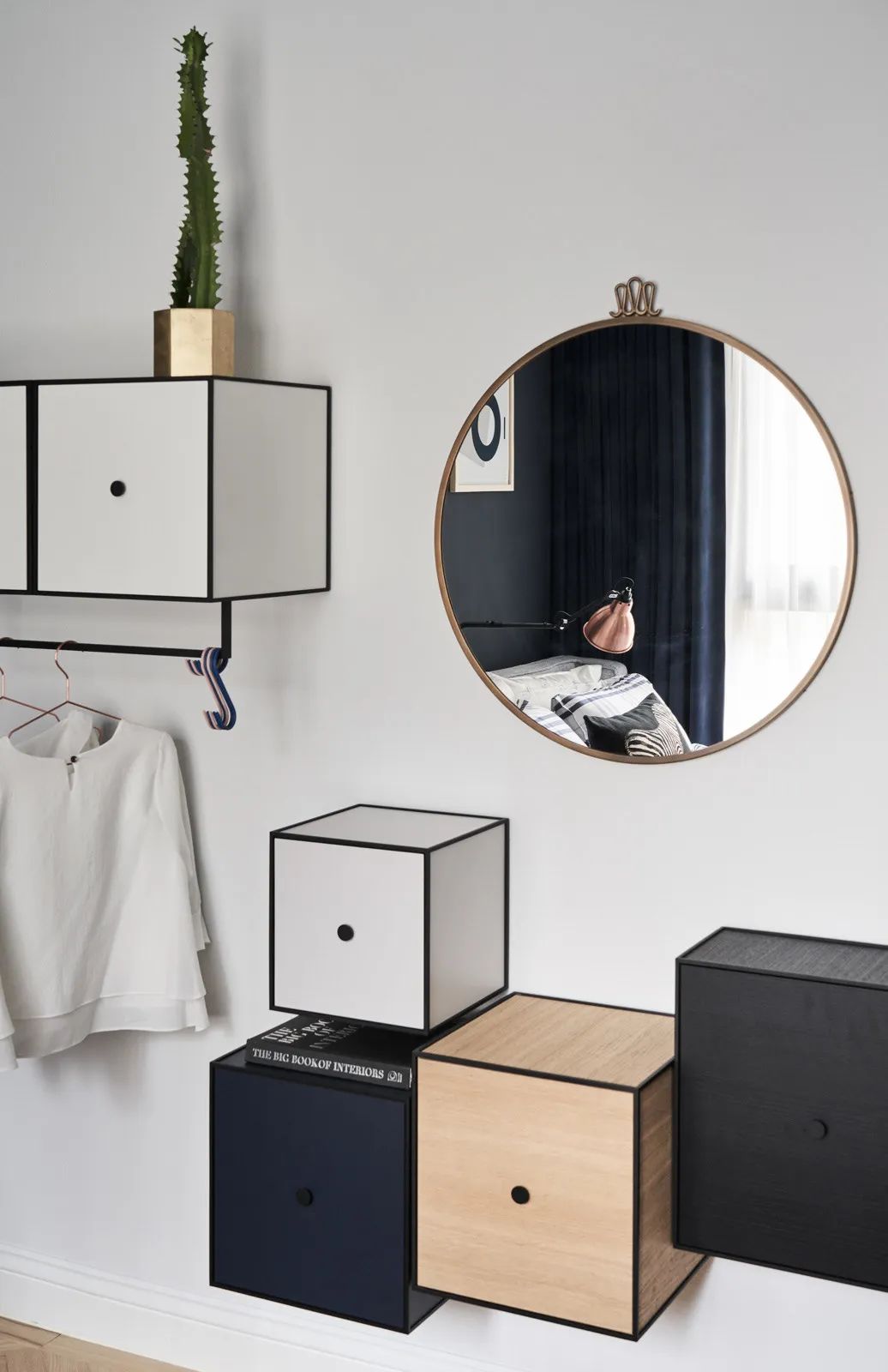 侧边墙面的方形收纳架以黑白木三色的组合,结合一面圆镜,呈现出一种独特优雅的时尚感。