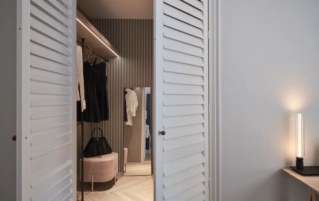 床尾位置布置一张小书桌,后方以百叶门的隔断隔出衣帽间区域。