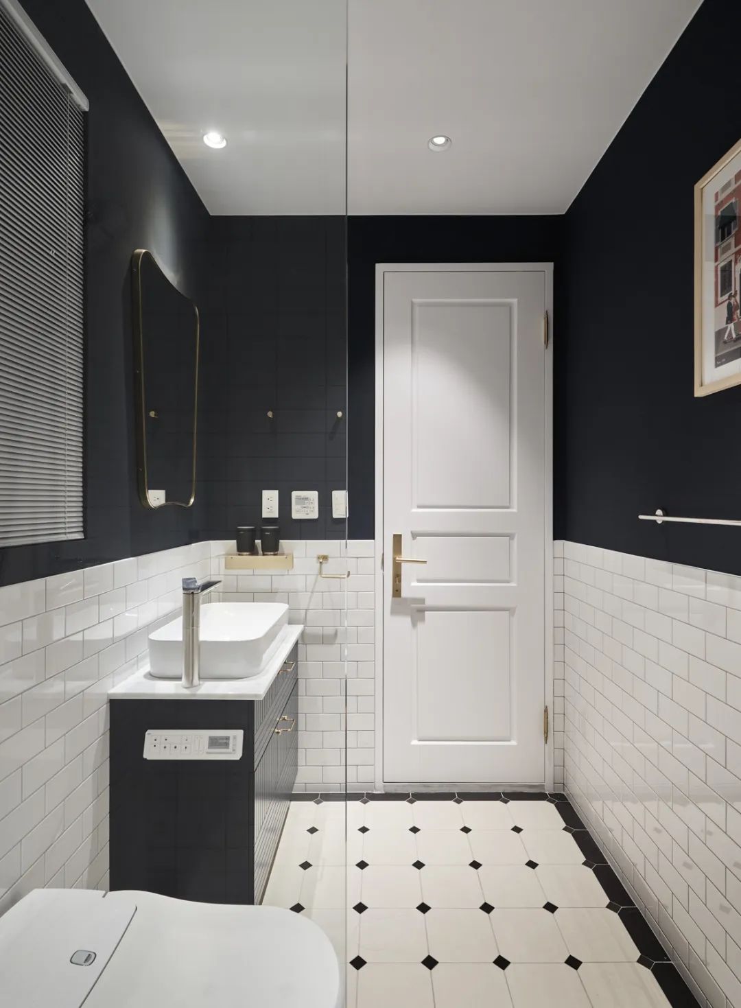 工字砖墙脚+黑色防水漆墙身,结合黑白配的浴室盆柜,带来的是现代时尚而端庄的卫浴空间感。
