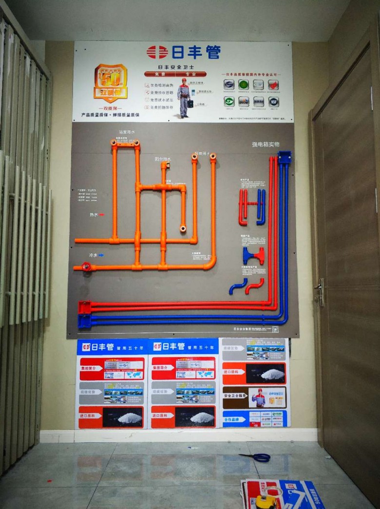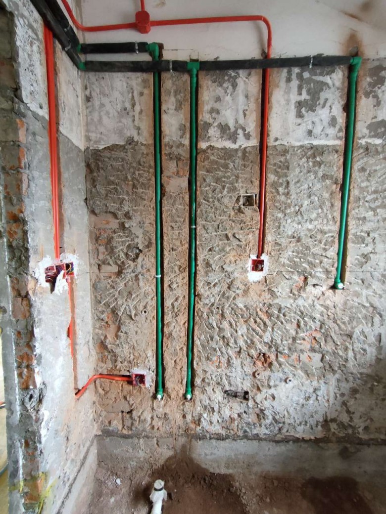 第二步,是水电。水电是一位大师傅带着两个年轻小伙子做了3天搞定。水电交底时,定好的方案是,走廊过道还有小客厅、阳台用筒灯,主副卧装吸顶灯。楼道和露台装壁灯,次卧小阳台由于两边打柜子,所以门框上头装一个长条壁灯。