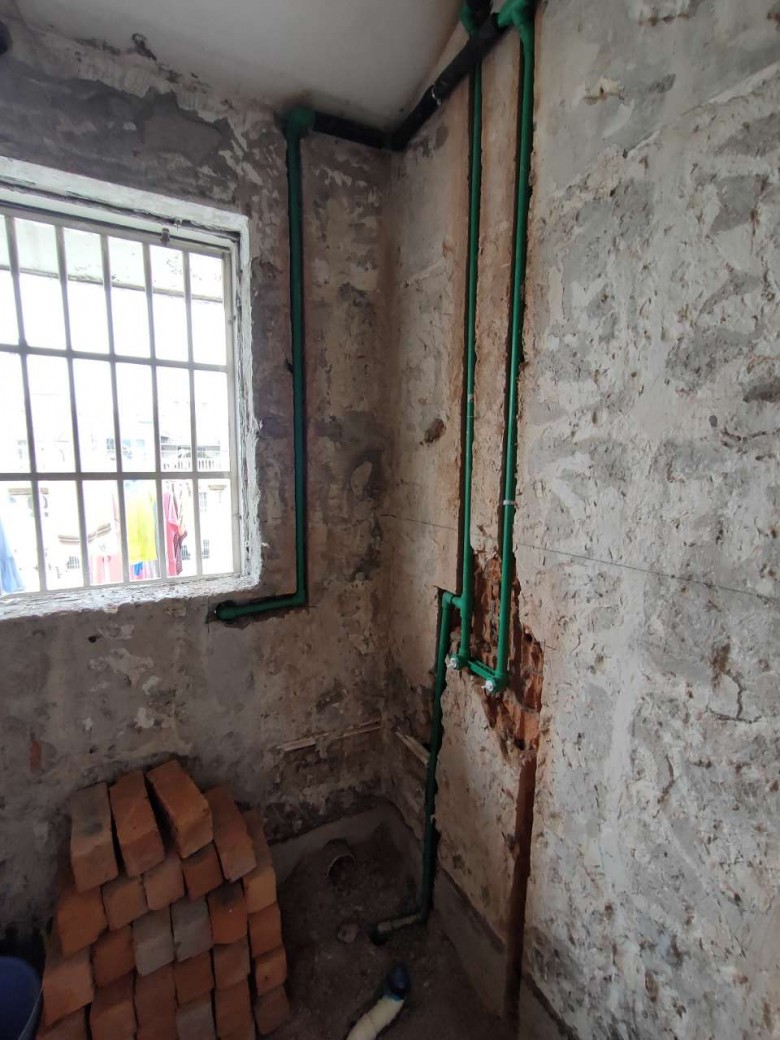 第一步先是拆旧。最主要的是卫生间铲平,原先卫生间的地面开发商在做的时候,地面被抬高了30公分,导致每次进出卫生间都不方便,特别是家里老人和小孩。这次装修和设计师反复讨论卫生间铲平,以及马桶移位。原先的马桶正对着卫生间的门,风水上讲不好(本人比较讲究风水),就反复的讨论马桶移位的方案。最终定下来,从楼下卫生间接管子,走到楼下客厅的大梁里面打孔穿到楼上卫生间,以后楼下装修的时候,把管子包好封起来,和吊顶一个面。