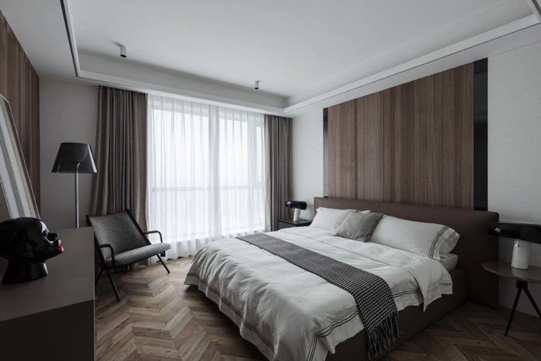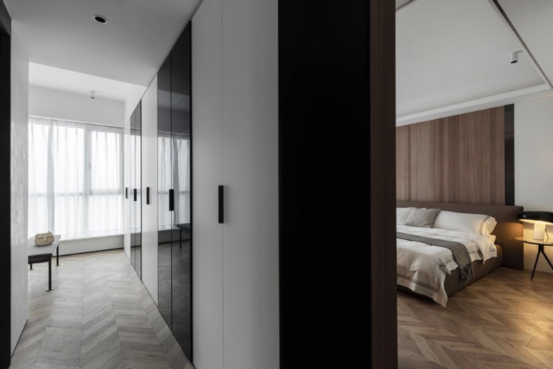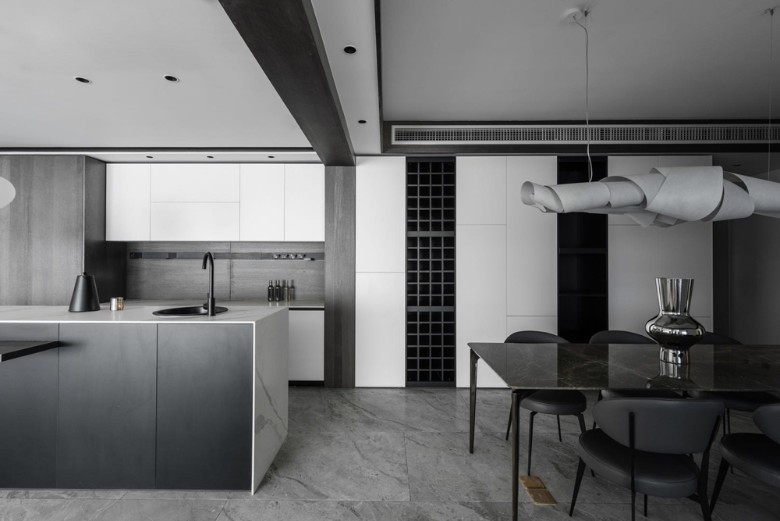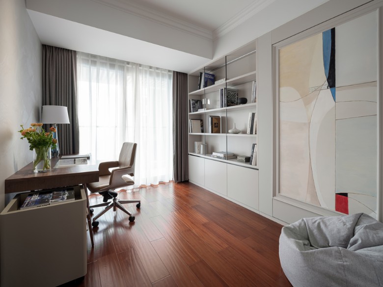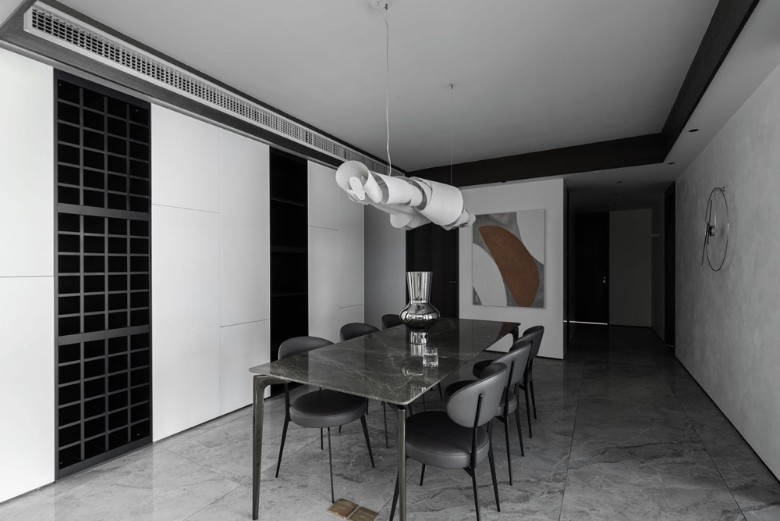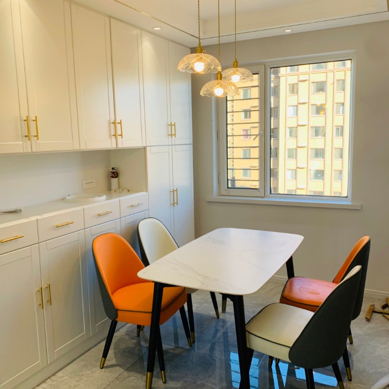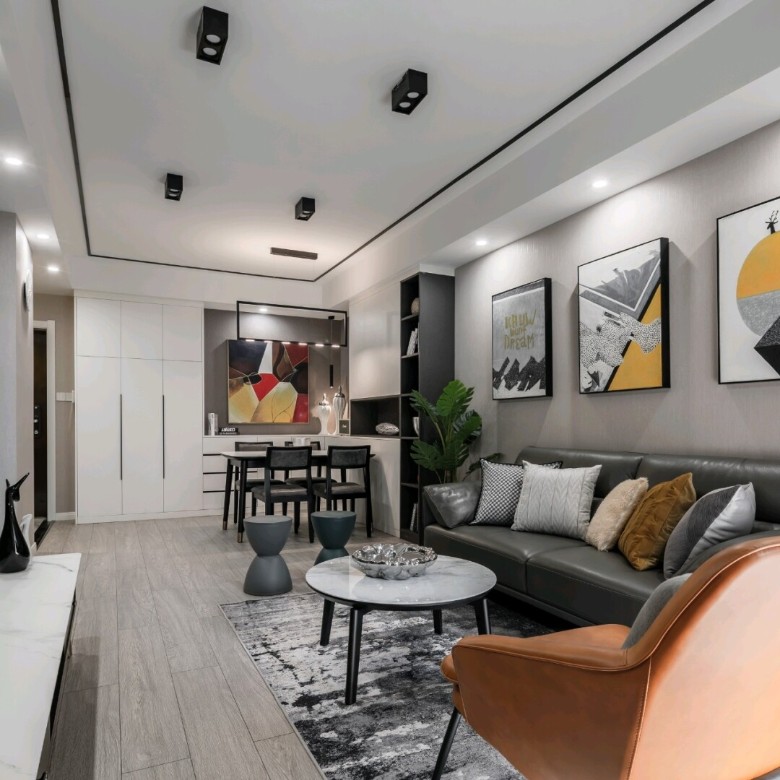 。墙面、顶面涂刷白色艺术漆,散发出陶瓷般光洁的质感。暖色的皮质沙发中和了冷色调,为空间注入了一丝暖意。客餐厅木地板和地砖的拼接,不仅丰富了空间的视觉效果,也同时划分了两个不同的功能区域。